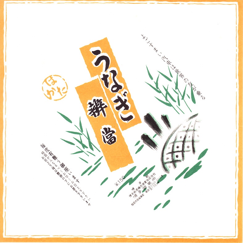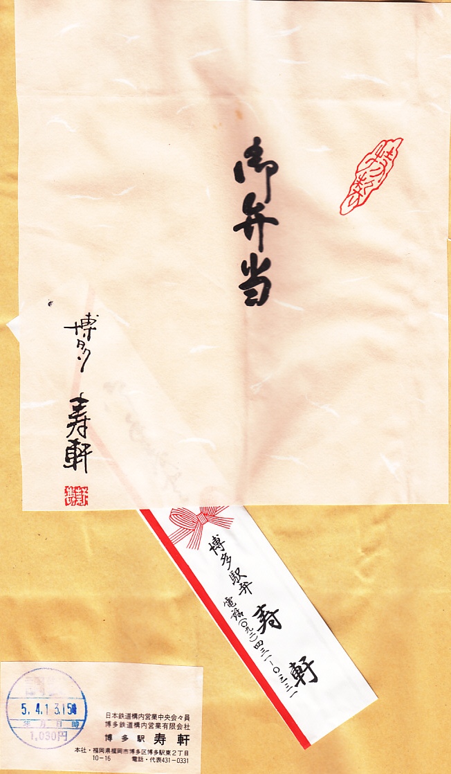 入手状況から1993(平成5)年4月13日15時の調製と思われる、昔の博多駅弁の掛紙の一部。上等の幕の内駅弁だろうか。