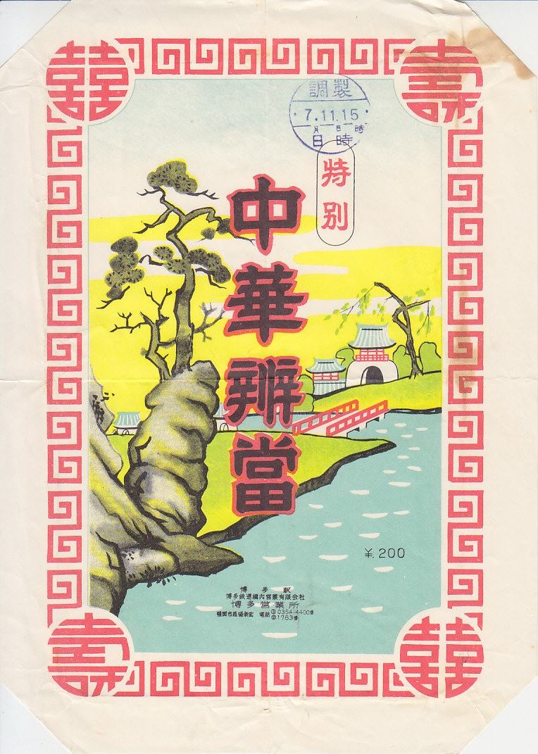 1960年代の、7月11日15時の調製と思われる、昔の博多駅弁の掛紙。中華弁当ということで、赤い雷紋に中国庭園という中華っぽい絵柄にしたのだろう。