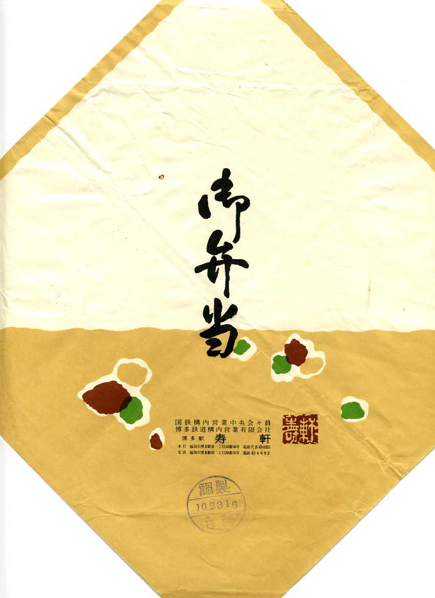 入手状況等から1970年代のものと思われる、昔の博多駅弁の掛紙。調製印は10月23日16時とある。博多駅東の住居表示が施行された1969(昭和44)年7月頃以降、福岡市が政令指定都市となり5区が発足した1972(昭和47)年4月より前のものか。絵柄はとくにない。