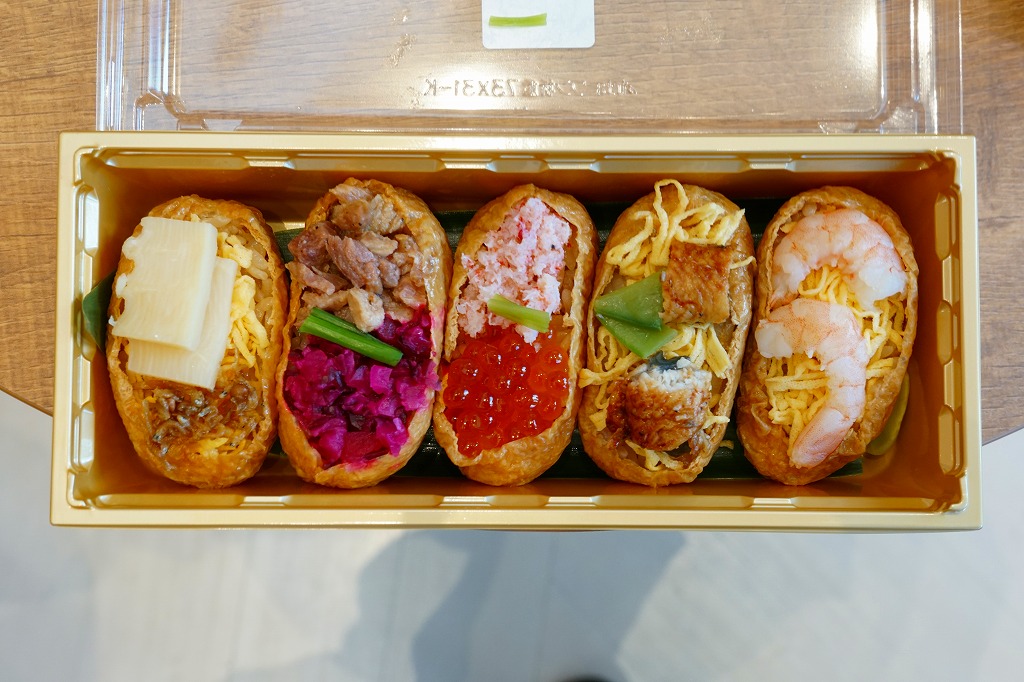 2019(平成31)年1月の阪神百貨店の駅弁大会で、博多駅の駅弁として販売。エビ、ウナギ、カニ&イクラ、肉&柴漬け、じゃこ&タケノコの、中身を見せた稲荷寿司を5個詰めて1,296円。おしゃれだけれども、激しく高価。それに、本当に博多駅で買えるのかどうかは分からない。現物に食品表示がなく、調製元は不明だが、ふたのシールに「TAKEMOTO」とあるため、福岡県小倉の寿司竹本ではないかと思われる。この催事以外で売られたのかどうかも分からない。