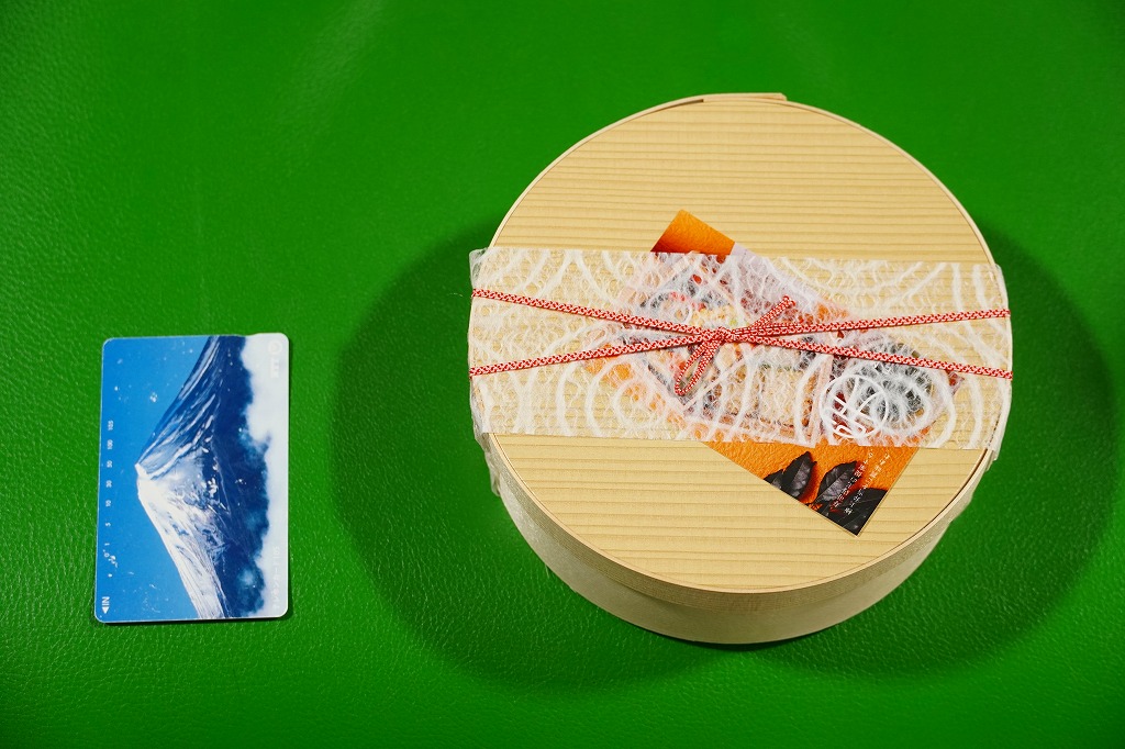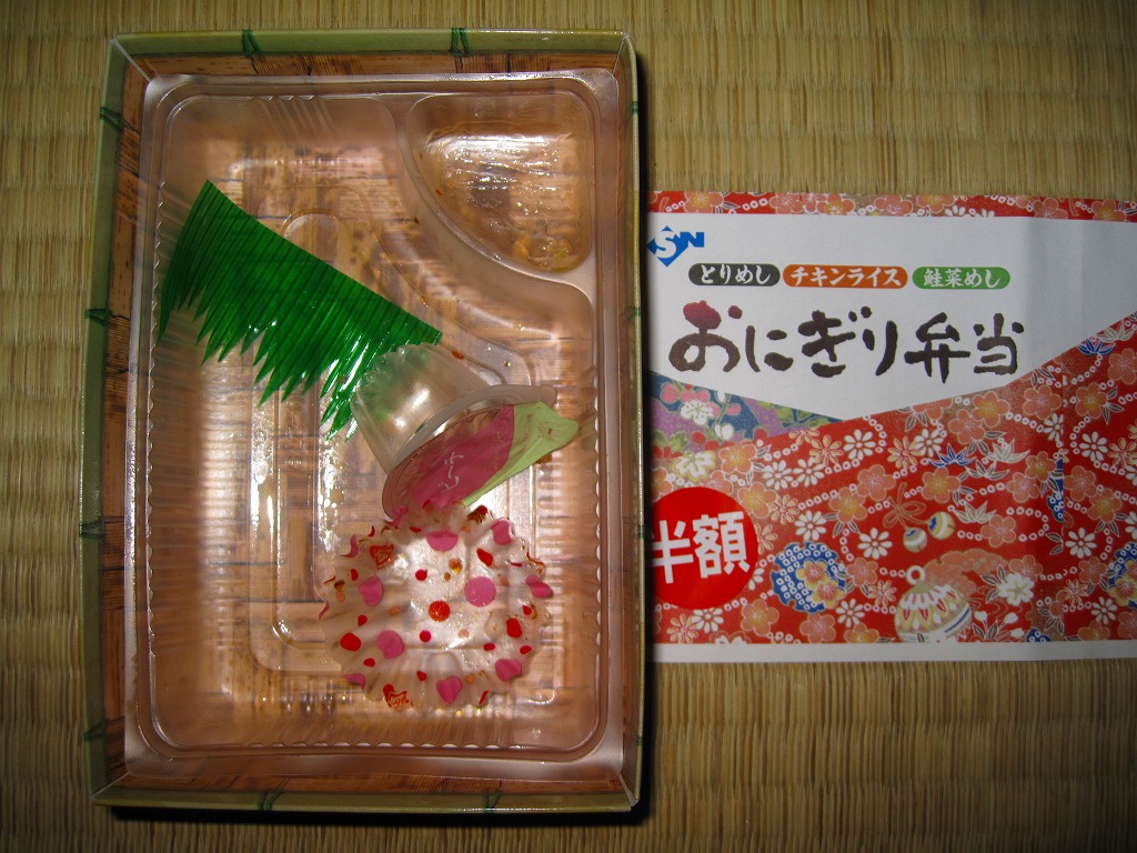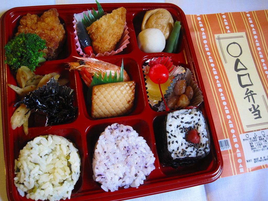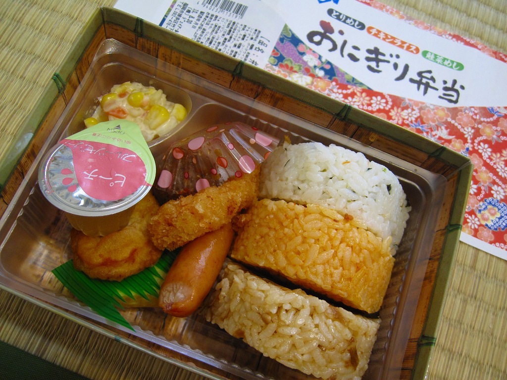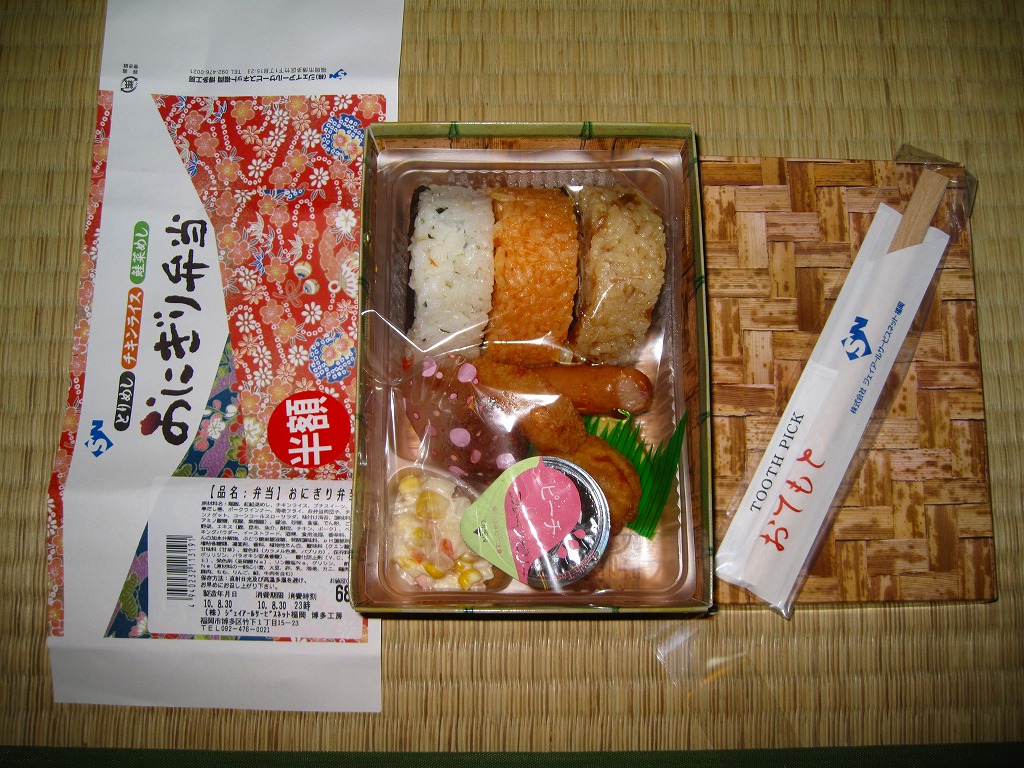 2007(平成19)年までに発売か。竹皮編みの長方形の容器に、中身の写真を掲載した掛紙を巻く。透明なトレーに収まる中身は高菜、明太子、しそ、かしわ、野沢菜の円筒形御飯が1本ずつと、焼サバ、ホタテフライ、玉子焼、シイタケやサトイモなどの煮物、ウインナー、わさび菜、昆布巻、ぎんなんが建ち並ぶもの。つまりおむすび弁当。見栄えも分量も価格も風味も、おにぎり駅弁の最高峰かと。