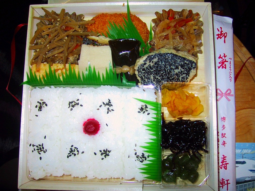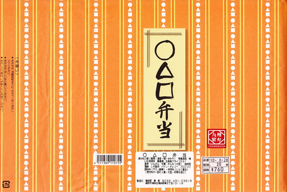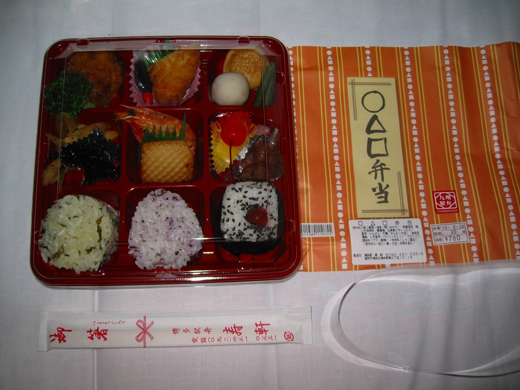 奇抜な駅弁の名前の由来や売り文句は現物にも現地にもないが、なるほど御飯の形状で○△□(まるさんかくしかく)なのかと。中身だけ見ればとんがっていない、普通のお弁当。2010年12月限りで寿軒が駅弁から撤退し、以後は小倉駅弁の北九州駅弁当が調製。価格は2010年の購入時で760円、2015年時点で800円。2016年までに終売の模様。