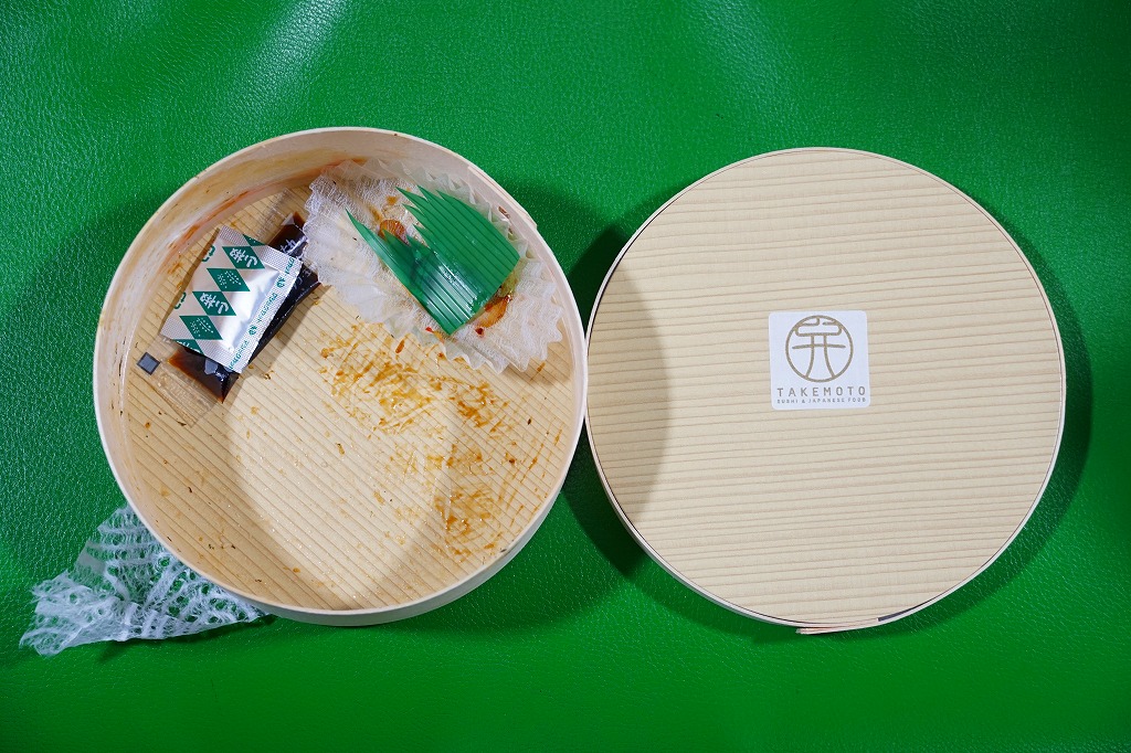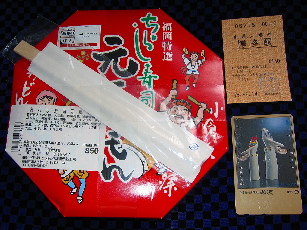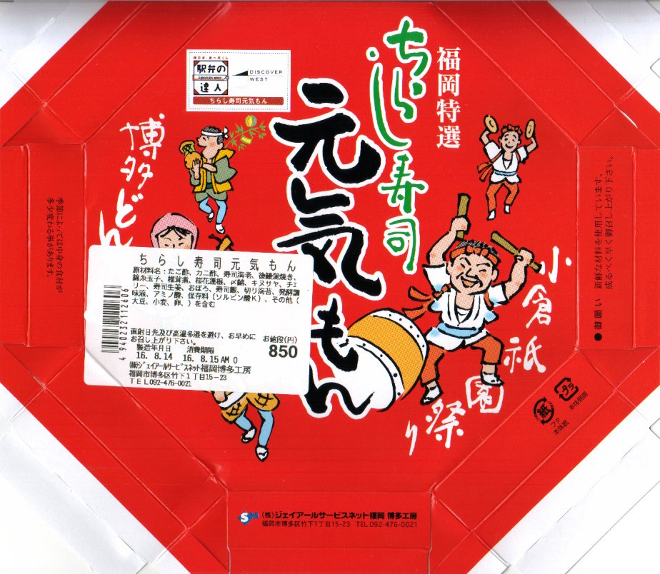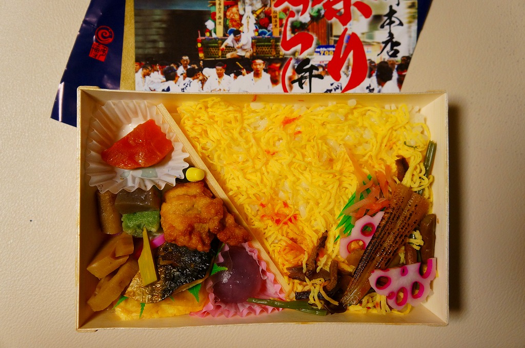 2013(平成25)年夏の新作か。長方形の木製エコ容器を、博多祇園山笠の写真を掲載した掛紙で覆う。中身は酢飯に錦糸卵を敷き、アナゴや山菜や刻みシイタケなどを載せ、焼サバ、鶏唐揚、レンコンやニンジンなどの煮物、出汁巻き玉子、水菓子などを添える。内容に特段の個性はなくても、なんとなく駅弁屋の駅弁とも、コンビニその他市販の弁当とも、異なるつくりをしているような気がする。この年限りの販売か。