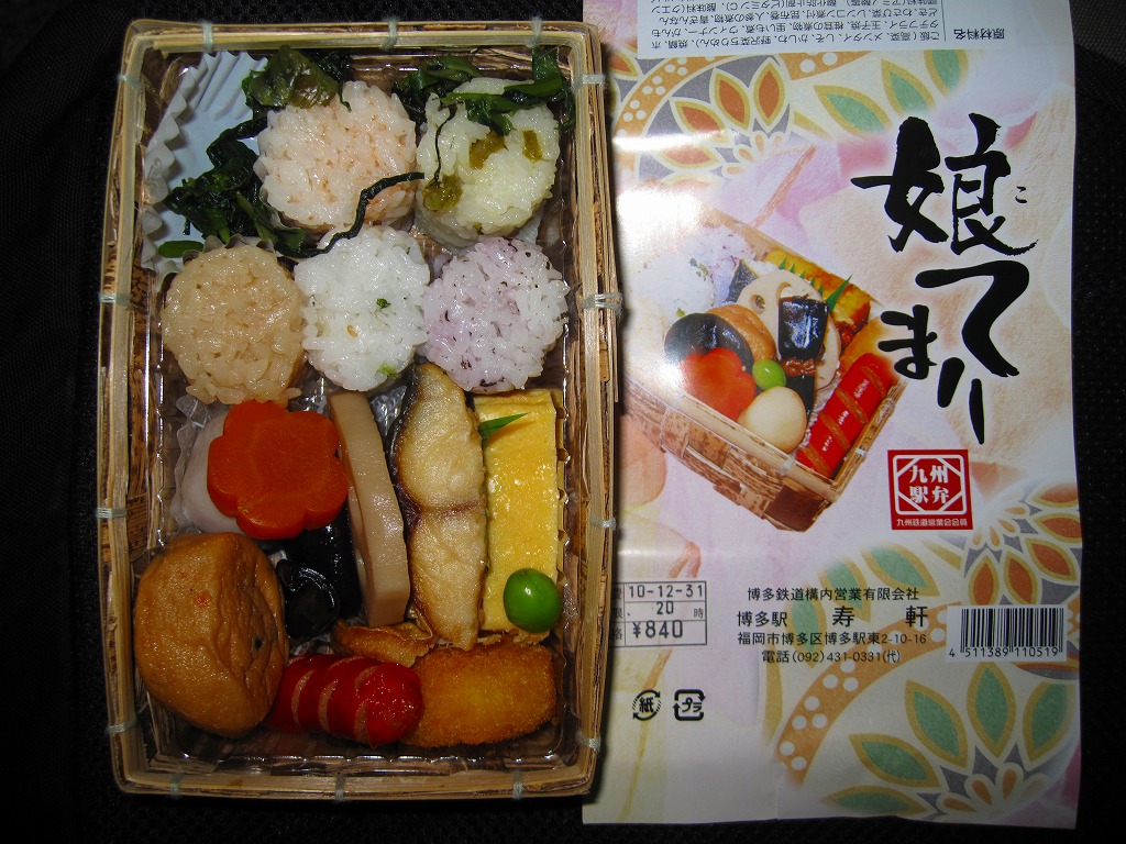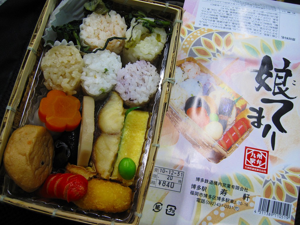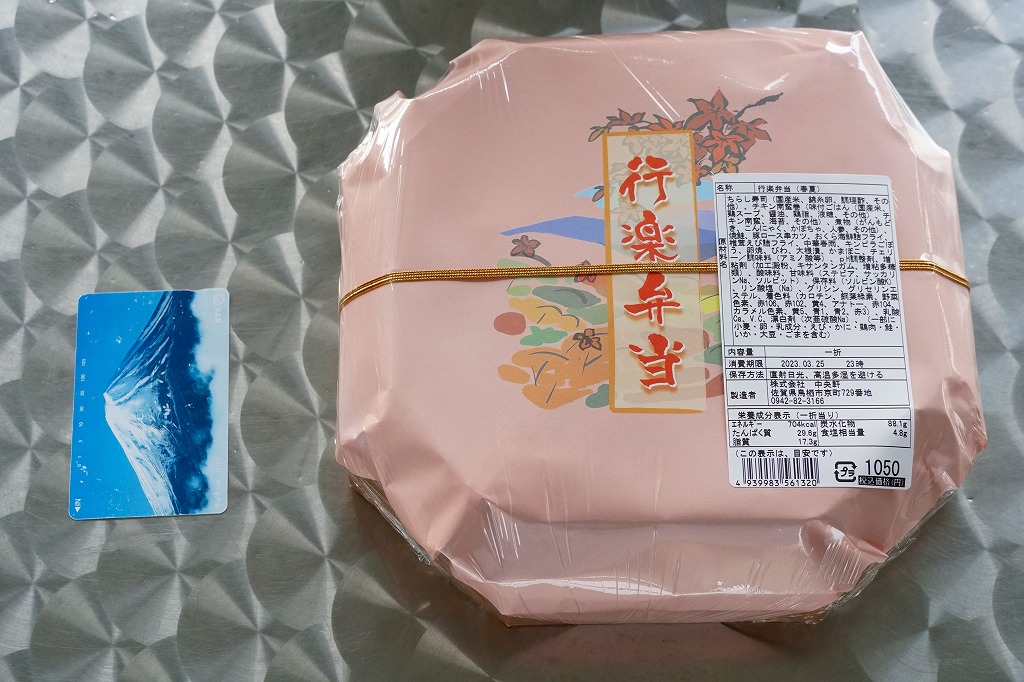 2000年代までには博多駅で発売か。八角形のプラ容器を包む大きな掛紙の絵柄に、駅弁らしい要素は見あたらない。中身はちらし寿司とチキン南蛮巻で2種類の御飯に、焼鮭とかまぼこと玉子焼、カボチャやコンニャクなどの煮物、串カツとおくら海鮮詰フライと椎茸えび詰フライ、きんぴらごぼうと大根漬、中華春雨とびわとチェリー。これはおつまみ弁当か、みんなでレジャーなお弁当の1人前か。上等幕の内駅弁の御飯を変えたような感じ。調製元は鳥栖駅の駅弁屋で、この駅弁は鳥栖駅で売らず博多駅へ卸す。価格は2010年時点で900円、2014年時点で930円、2023年時点で1,050円、2024年時点で1,080円、2025年時点で1,260円。