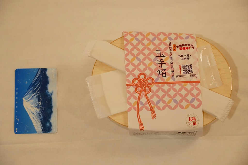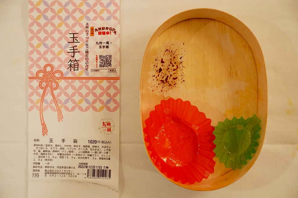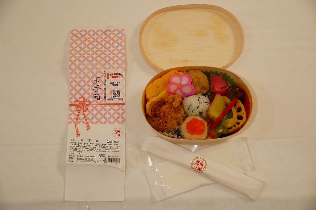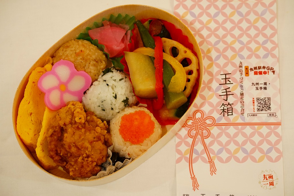 2020(令和2)年の発売か。現物から読み取りにくいが、駅弁の名前は「九州一周玉手箱」とされることがある。2022年のJR九州の駅弁キャンペーン「第13回九州駅弁グランプリ」にエントリー。この調製元はかつて「オール九州玉手箱」という駅弁を販売しており、あるいはこれのリニューアルかもしれない。楕円形の容器に、鶏めし、わかめ、明太子の球形おにぎり各1個を並べ、鶏唐揚、玉子焼、花かまぼこと、かぼちゃ、さつまいも、れんこん、オクラ、パプリカ、大根桜漬も詰める。地元の駅弁であることに違いないが、博多、福岡、九州らしさをほぼ持たない、きれいなお弁当。価格は2022年の購入時で1,020円、2023年時点で1,090円。