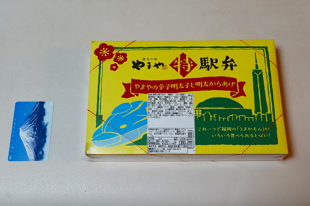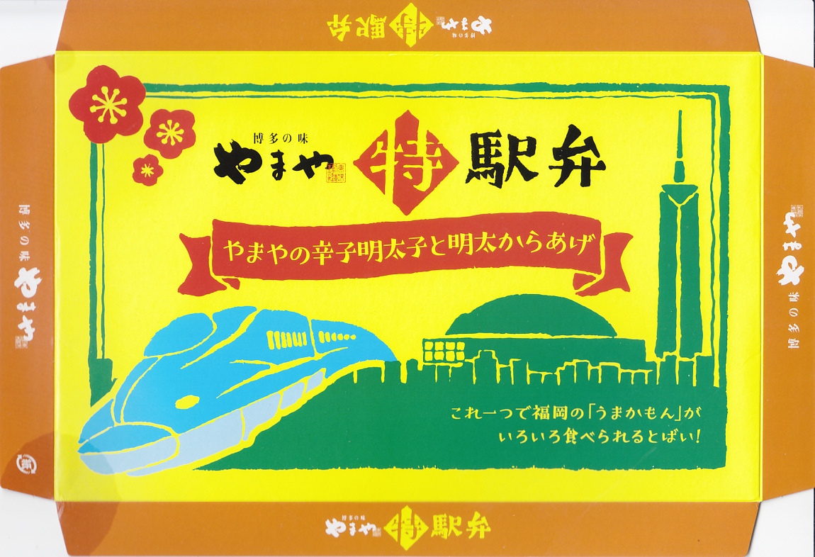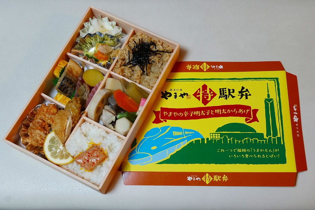 2019(令和元)年の5月までに発売か。駅弁の名前は「博多の味やまや特駅弁」とも。専用の紙箱には電車と福岡ドームと福岡タワーを描いたのだろうか。6区画の中身は、白飯と辛子明太子、「がめ煮」という筑前煮のようなもの、鶏そぼろ飯、鶏皮餃子にチキンカツ、焼サバに玉子焼に牛肉煮、酢の物とゆず大根。明太子の存在感が薄い、賑やかなお弁当。調製元の博多いもっ子屋は、以前に天神のバス弁を調製していた惣菜店で、2017年頃から博多駅の駅弁売店に弁当を卸し始めたらしい。