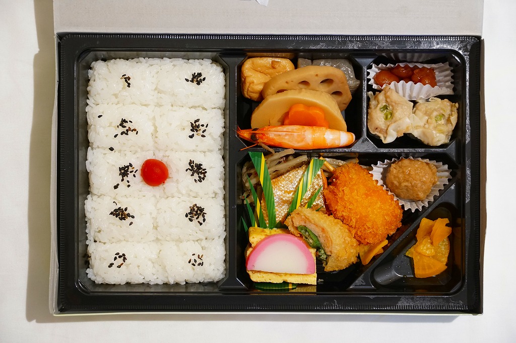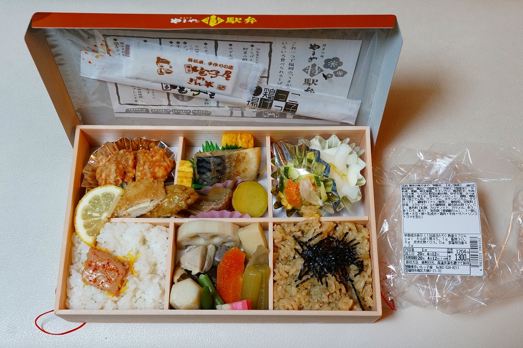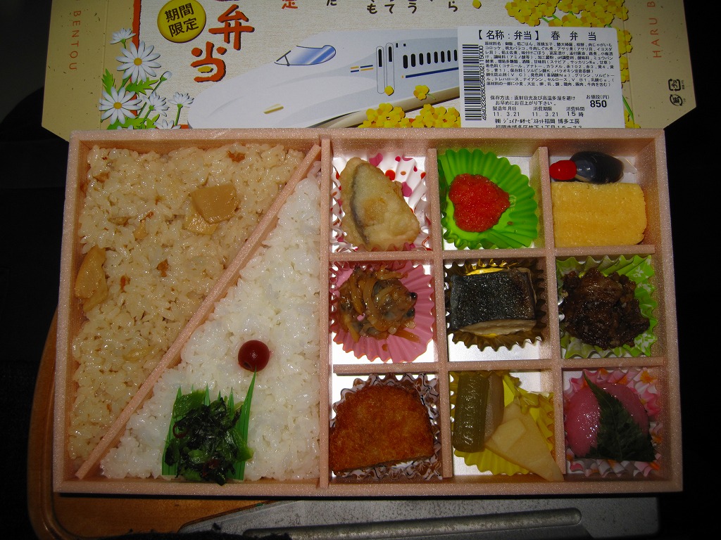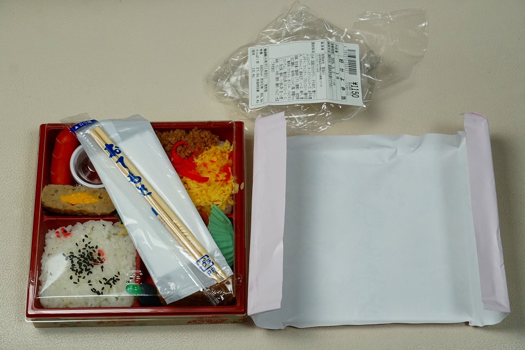長方形の容器に、花や車両のイラストを描いたボール紙でふたをする。中身は日の丸御飯とタケノコ御飯、玉子焼、牛肉しぐれ煮、明太子、アサリ、アジ塩焼、サワラ天ぷら、肉じゃがコロッケ、タケノコなどの煮物、桜餅。