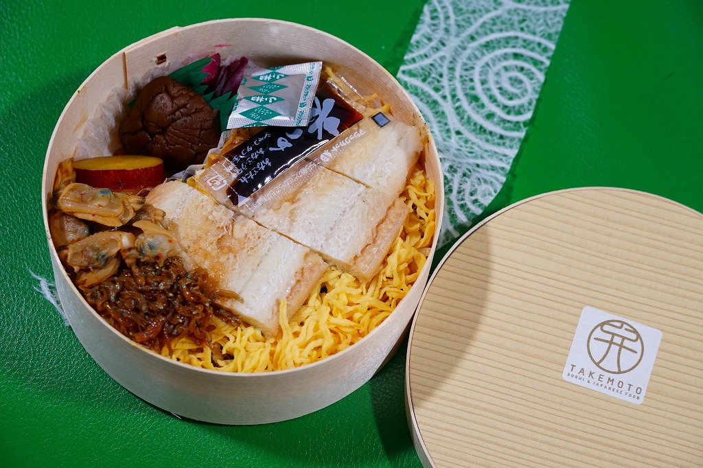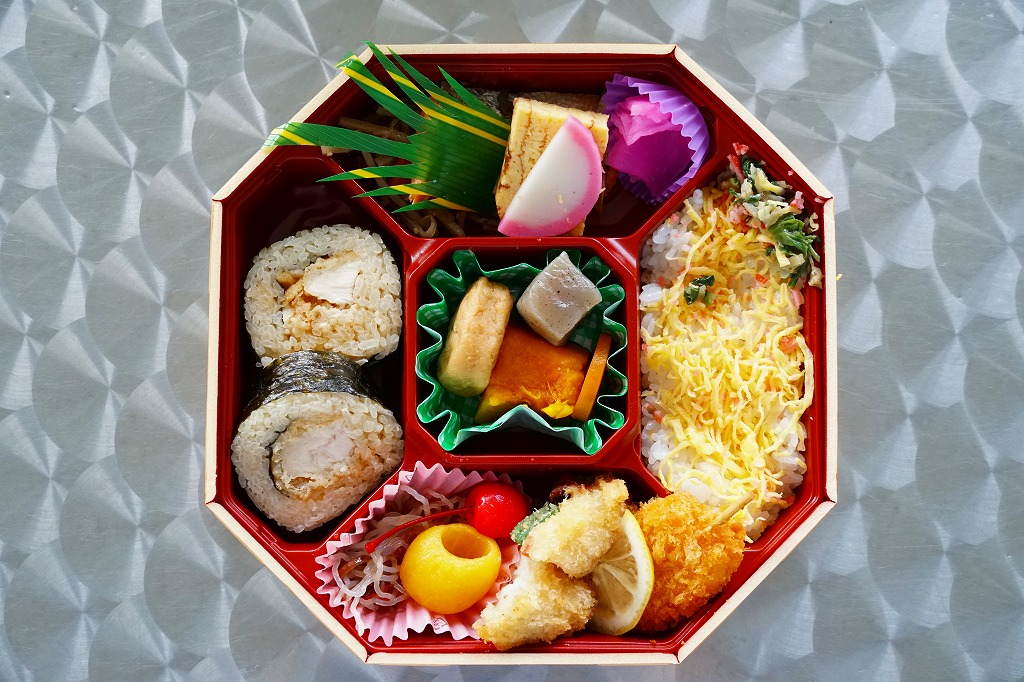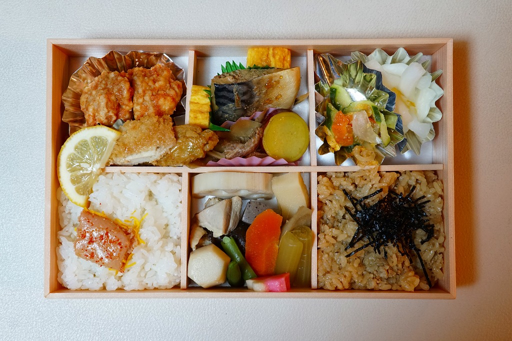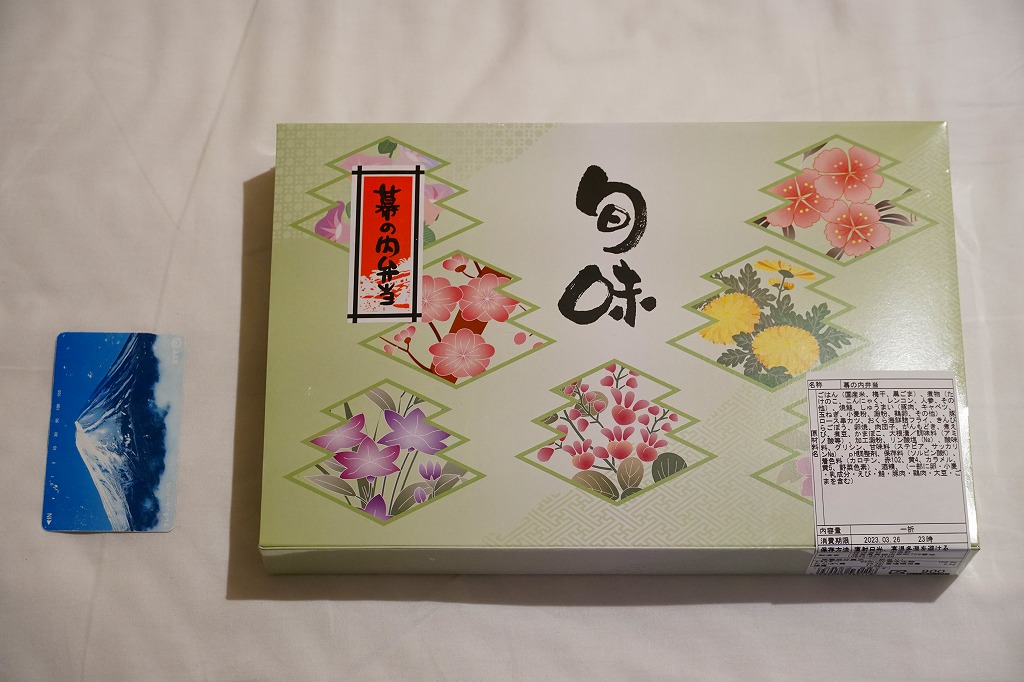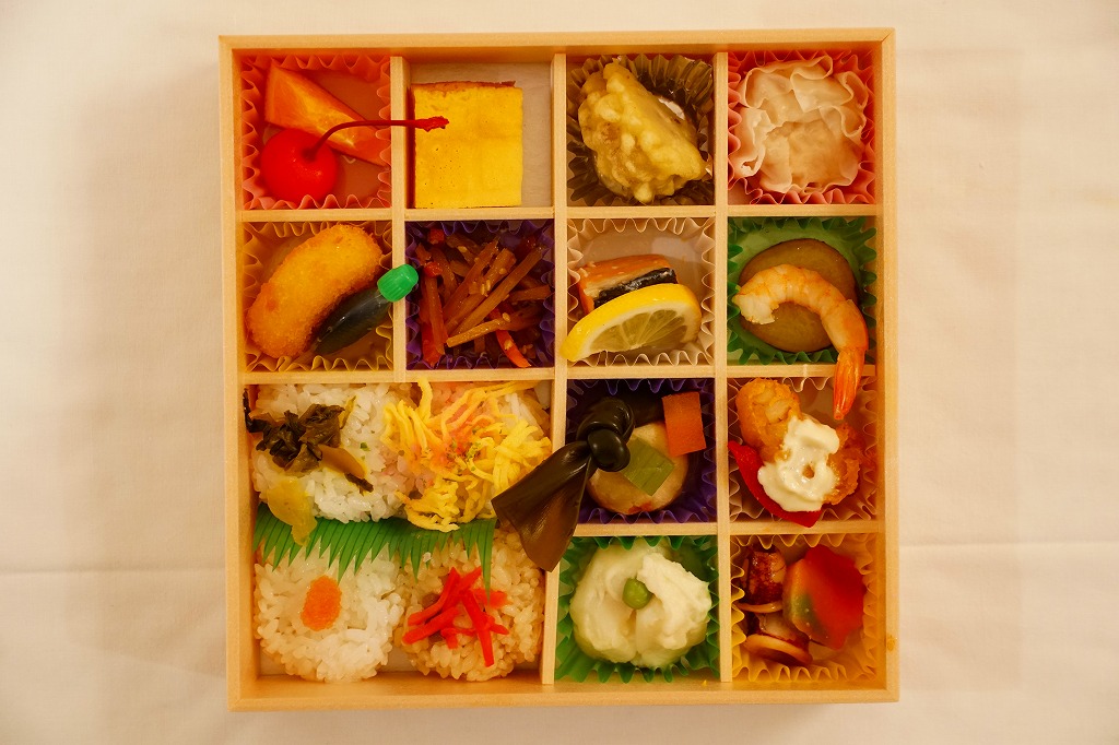 長方形の容器に、花や車両のイラストを描いたボール紙でふたをする。中身は日の丸御飯とタケノコ御飯、玉子焼、牛肉しぐれ煮、明太子、アサリ、アジ塩焼、サワラ天ぷら、肉じゃがコロッケ、タケノコなどの煮物、桜餅。