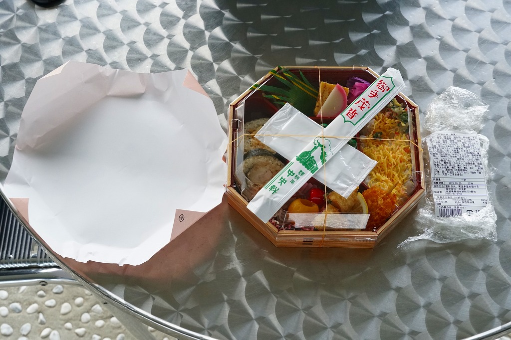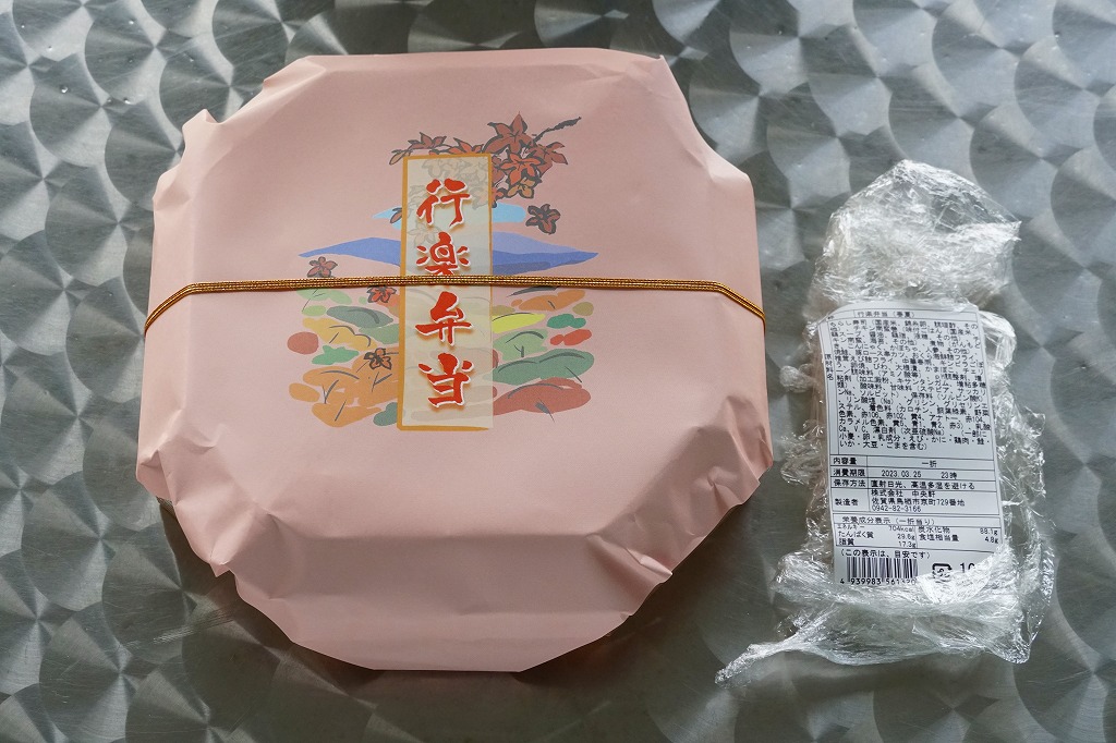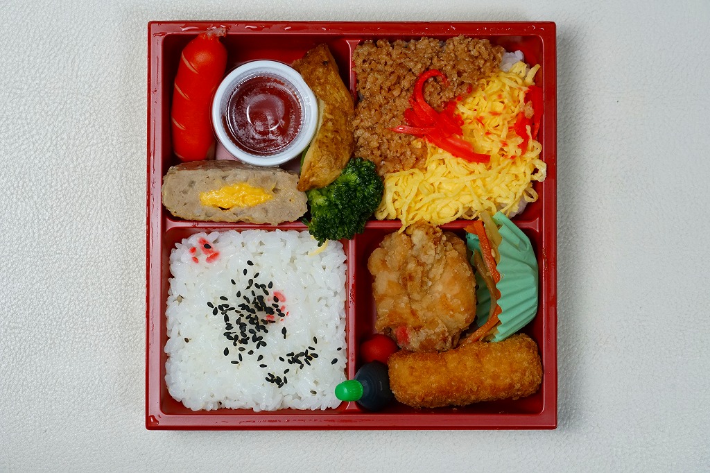 2024(令和6)年までに博多駅で発売か。松花堂弁当のような正方形の4区画に浅く平たく、白飯と黒ごま、白飯と錦糸卵と鶏そぼろと紅生姜、鶏唐揚ときんぴらごぼうとカニクリームコロッケ、チーズインハンバーグとポテトとウインナーとブロッコリーとケチャップ。福岡博多の諸行事を描いた掛紙と違い、中身は郷土料理でも幕の内弁当でも鶏飯などでもない、最近の駅弁ではあまり見なくなったお好み弁当という感じ。個性がないから実用的な道中の食事。