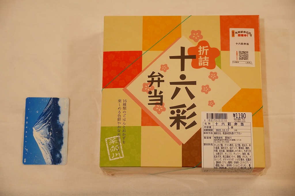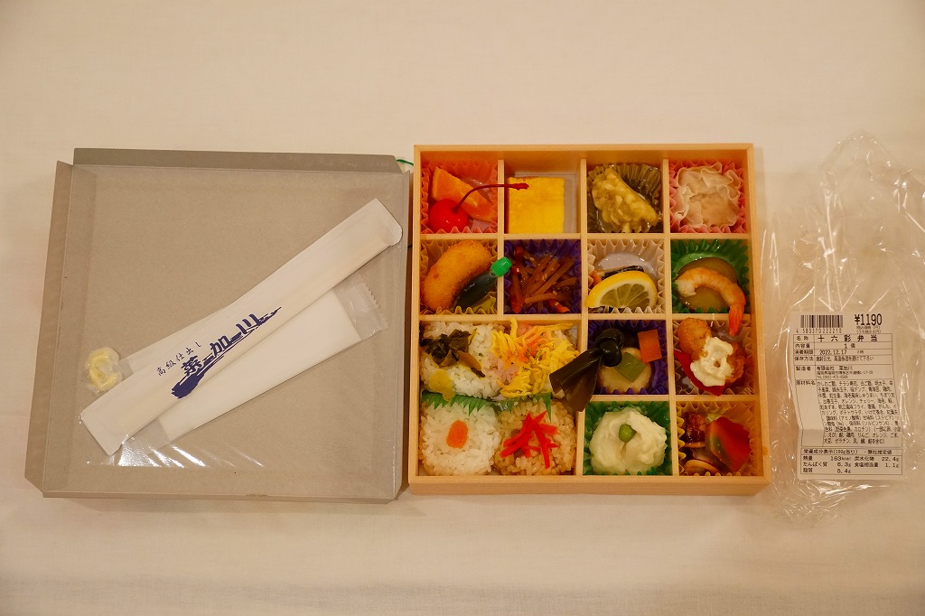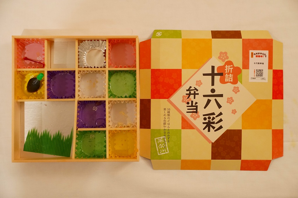 2017(平成29)年までに発売か。調製元の団体・旅行会社専用弁当に同じ名前の商品があり、それを駅弁らしく仕立てたものかもしれない。商品名に市松模様のふたには、「16種類のごはんとおかずを楽しめる色鮮やかなお弁当です。」と書いてある。中身はそのとおり13区画に16種類あり、かしわ、ちらし、高菜載せ、明太子載せで4種類の球形御飯に、ポテトサラダ、イカリングと紅葉夫、昆布の結びとがんも、鶏唐揚、帆立風味フライ、きんぴらごぼう、焼鮭、海老とサツマイモ、オレンジとチェリー、玉子焼、ちぎり天、海老風味しゅうまい。これは賑やかな、おつまみ弁当。