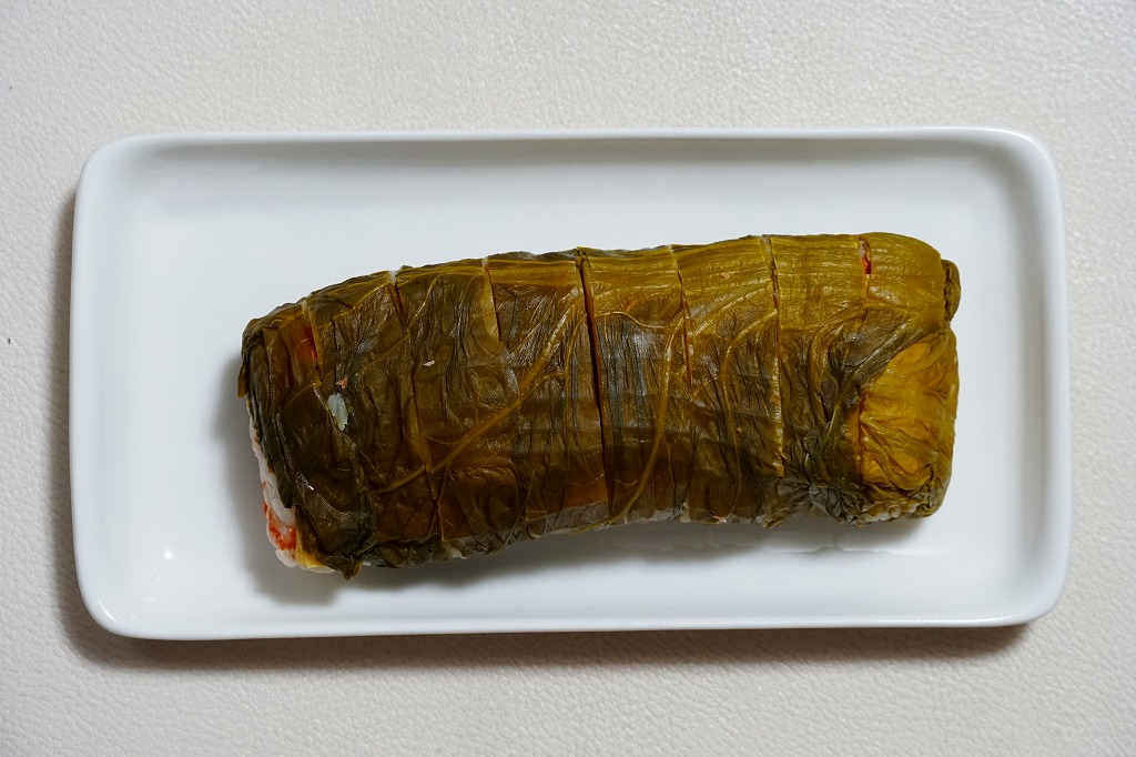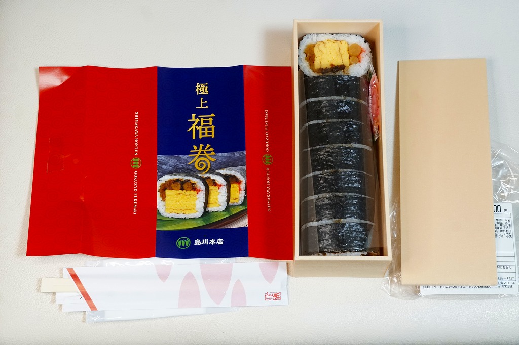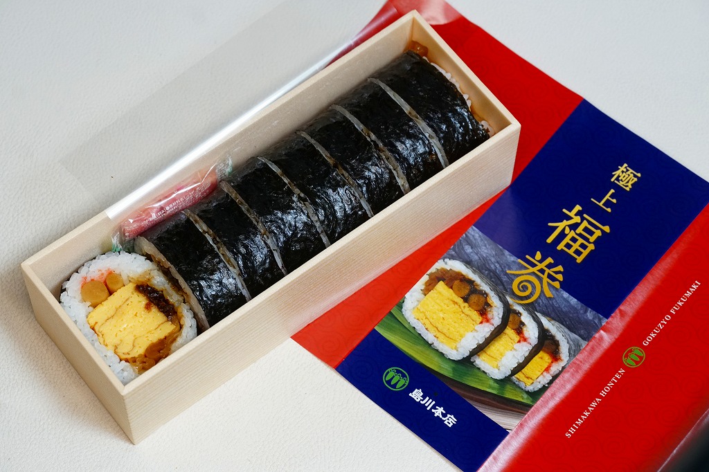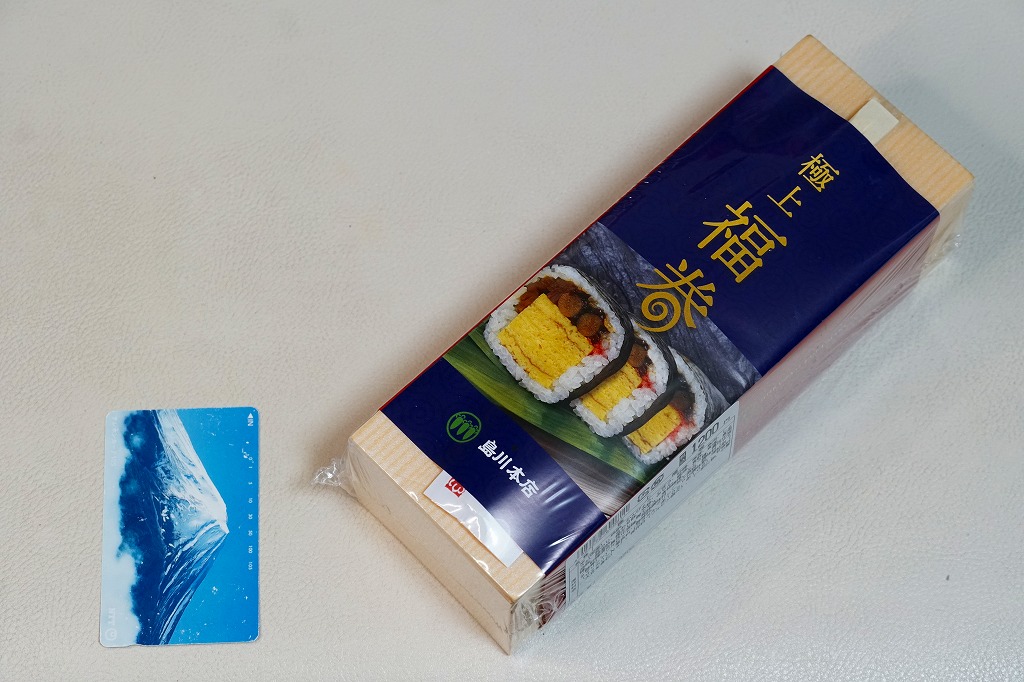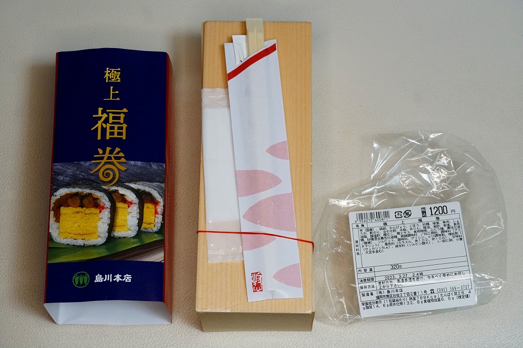 2022(令和4)年の夏までに、博多駅で発売か。太巻きが1本、8切れにカットされ、細長い箱に収まり、掛紙を巻かれる。中身は掛紙の写真にあるとおり、酢飯と玉子焼とごぼうとかんぴょうを、シイタケや紅生姜などとともに海苔で巻いたもの。飯が薄く、玉子焼が厚く、たとえれば饅頭に対する薄皮饅頭のような高級品に思える。玉子焼がメインなので、味も柔らかく、極上な福巻という名に合う。高価な材料でないので、お値段は控えめ。