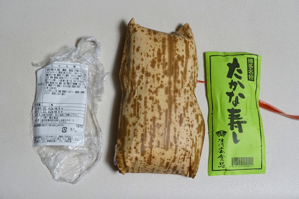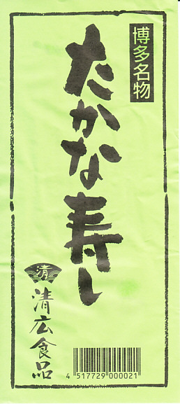 駅では1980年代に発売か。商品の名前どおりのたかな寿しが、玉子焼と鮭フレークを貼り付けたコシヒカリの酢飯を、高菜の漬物で巻いて、8切れにカットして透明な袋に密封し、竹皮で包んで掛紙を置き、ひもで縛りラップを巻く。駅弁として紹介されることはなくても、在来線特急「有明」が走り車内販売があった頃から、この地におなじみの存在。「いわしずし」「さばずし」とこれの3種類が、姿を変えずに売られる。福岡空港の空弁と紹介されることもある。価格は2010年時点で840円、2015年時点で870円。2022年に廃盤か。