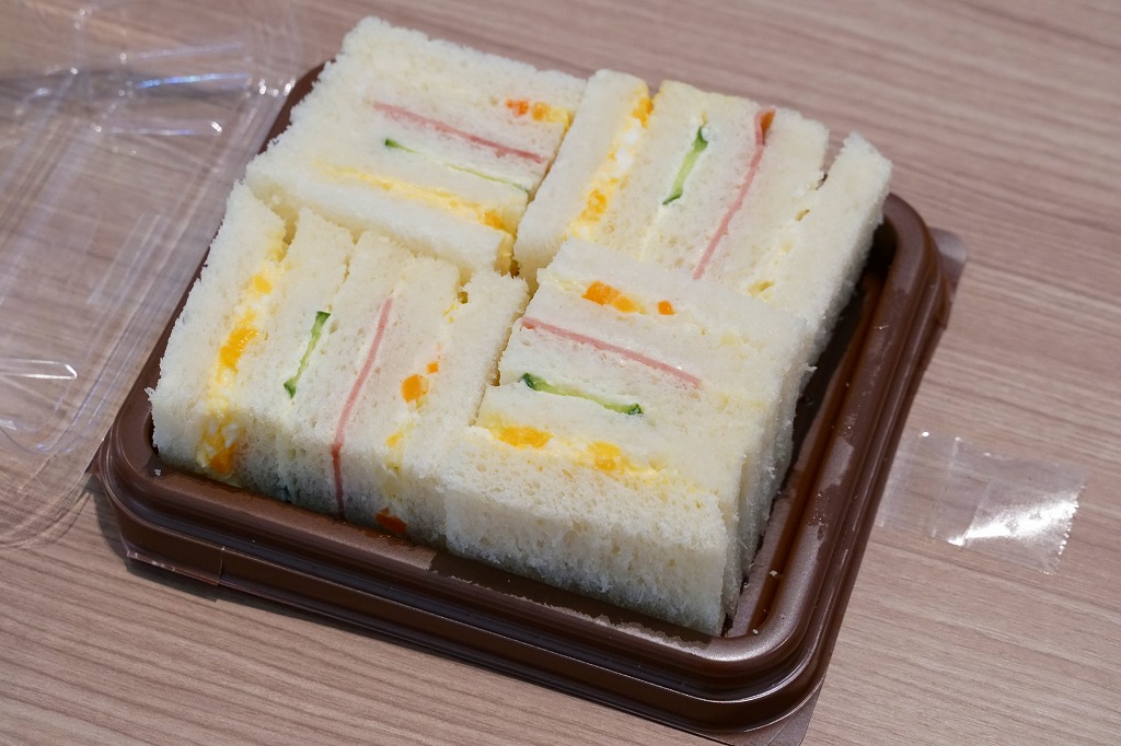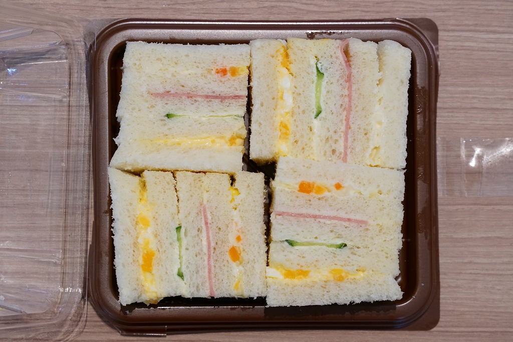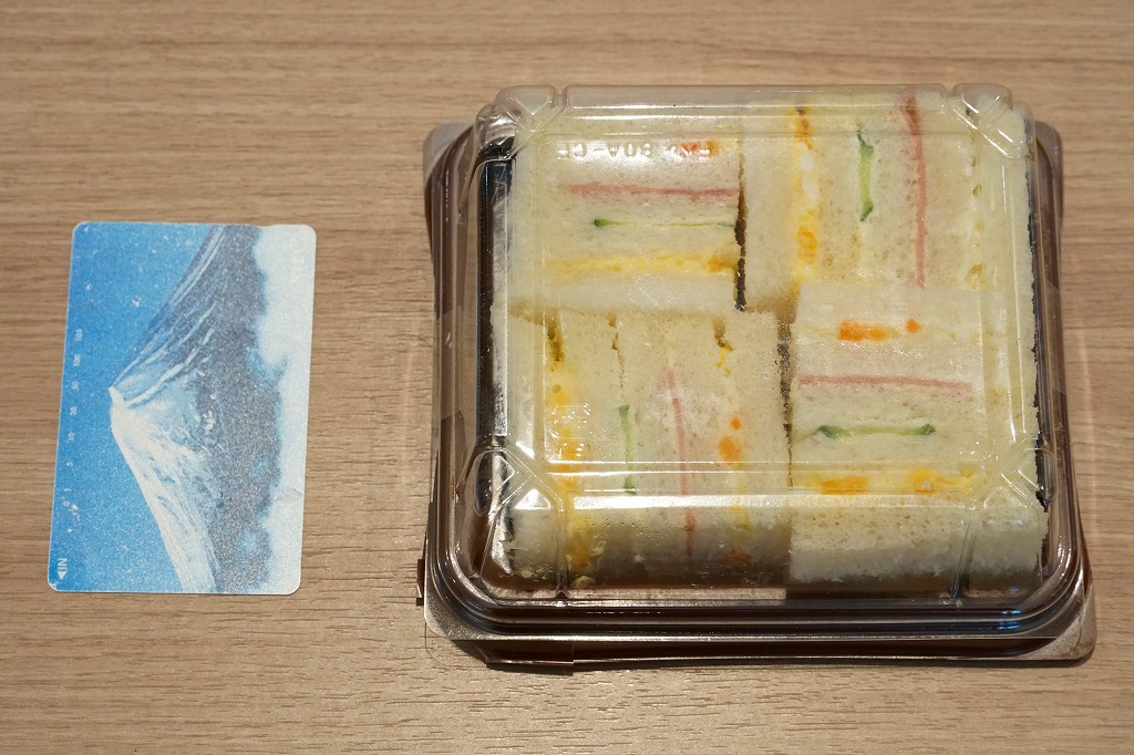 博多駅の駅弁売店で買えたサンドイッチ。サンドイッチ惣菜向けのプラ容器に、オードブルで出てきそうな四角く小さなサンドイッチが、四方に向いて4個。耳なし食パン5枚で、コーンコールスロー、タマゴサラダ、きゅうり、ハムを4層に挟むため、ミルフィーユの名を付けたのだろう。味もかわいらしく。駅弁屋や車内販売が箱サンドを売る時代が過ぎ、列車内でサンドイッチを調製した食堂車やビュフェの存在は歴史の向こうに。そんな役割を補うこんな商品が、珍しくも博多駅で駅弁とともにひっそり売られていた。