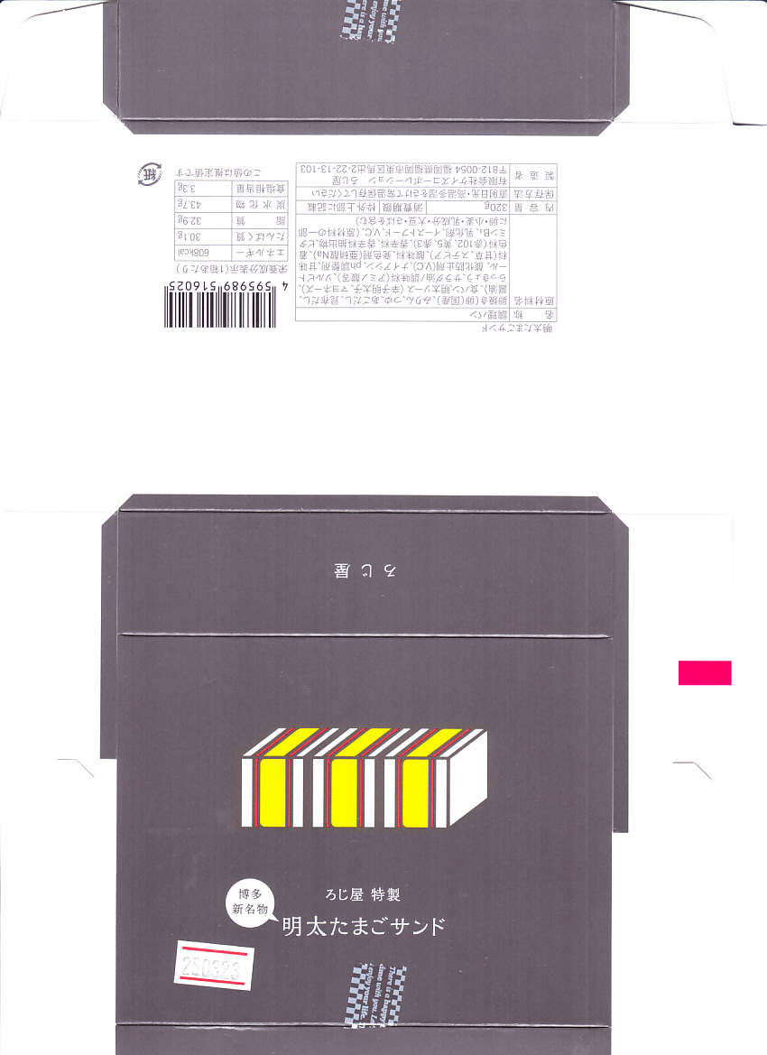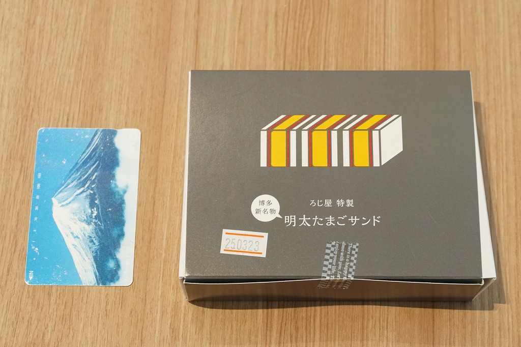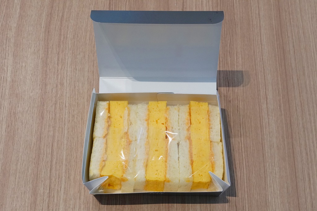 博多駅の駅弁売り場で買えたサンドイッチ。福岡市箱崎で2020年に創業しただし巻きたまご専門店の主力商品で、市内や空港や催事などで売られるものらしい。黒い箱に見える専用の紙箱に、今風なふんわり厚めの玉子焼を使うサンドイッチ。だし巻きの厚焼きたまごの両面明太マヨソースを塗り、耳なし食パンで挟んだサンドイッチを6個に分けて、フィルムを介して箱詰めする。すべてにおいて刺激がなく柔らかな、甘くないけれどスイーツのような食べ物。