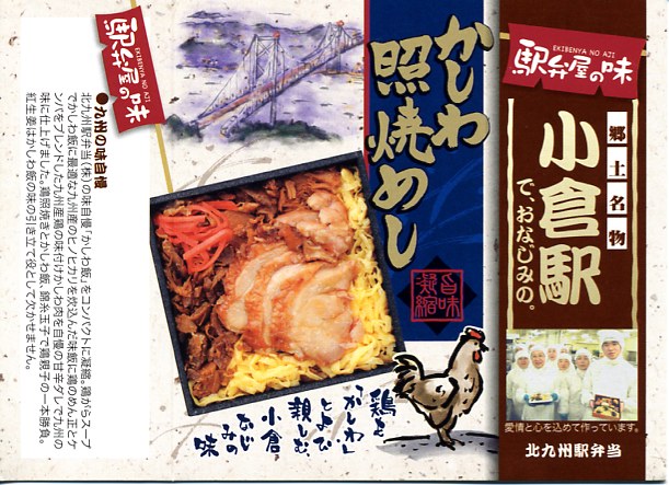 小倉駅弁のかしわめし。九州の北部を中心に各地で売られる鶏飯駅弁「かしわめし」の、小倉駅バージョン。鶏の炊込飯を、刻み海苔と錦糸卵と鶏フレークのストライプで覆い、紅生姜で彩り、玉子焼、切り干し大根、みかん、大根桜漬、うぐいす豆を添える。かしわめし駅弁の中では、付合せの行列が差異であり、味が比較的淡く薄めで、塩気や醤油味より油気が勝ると思う。スーパーやデパートでよく輸送販売されるため、関東地方など東日本では、これが折尾駅や博多駅のかしわめしだと勘違いされることがある。価格は2002年時点で680円、2010年時点で750円、2014年時点で780円。