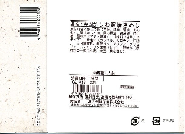 上記の駅弁「北九州名物鶏(かしわ)めし」の、2002(平成14)年時点での姿。当時は鶏飯を覆う刻み海苔と錦糸卵と鶏フレークが、ストライプでなくブロックパターンであり、これが小倉駅弁の特徴であった。おかずはかまぼこ、玉子焼、昆布巻、さといも、エビフライ、れんこん、きんぴら、うぐいす豆となっていて、後のものより少し優れていた。