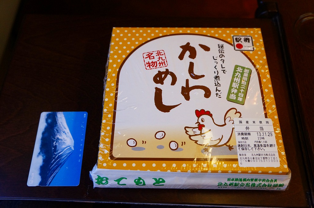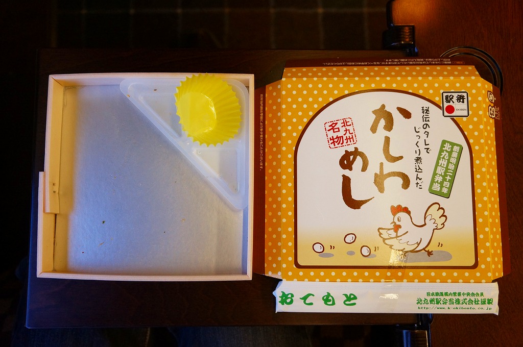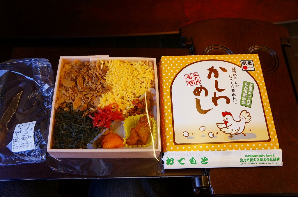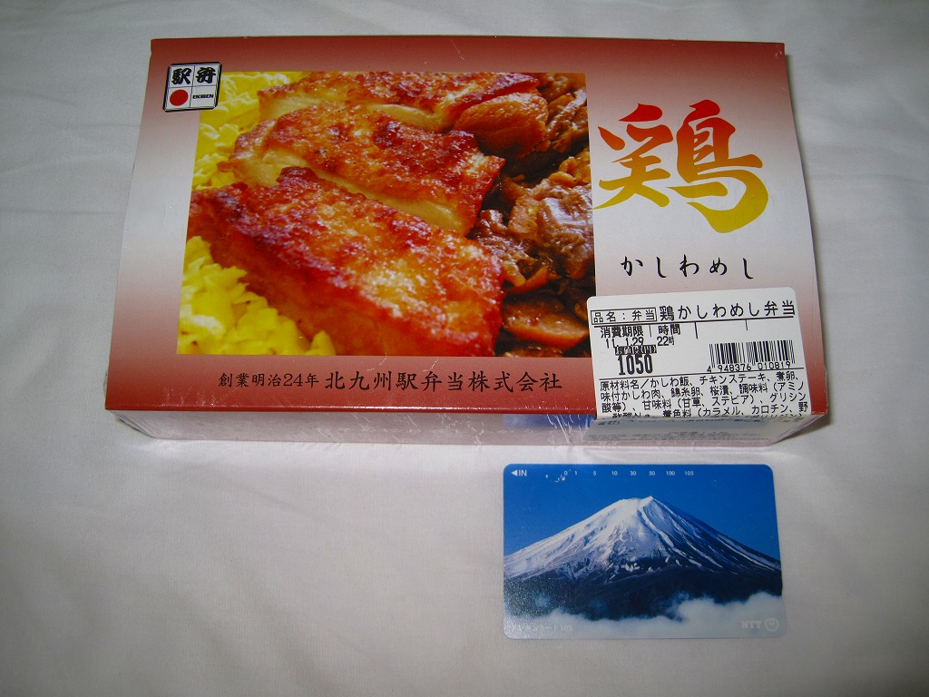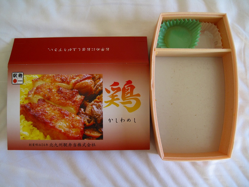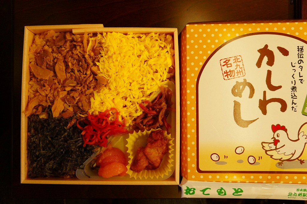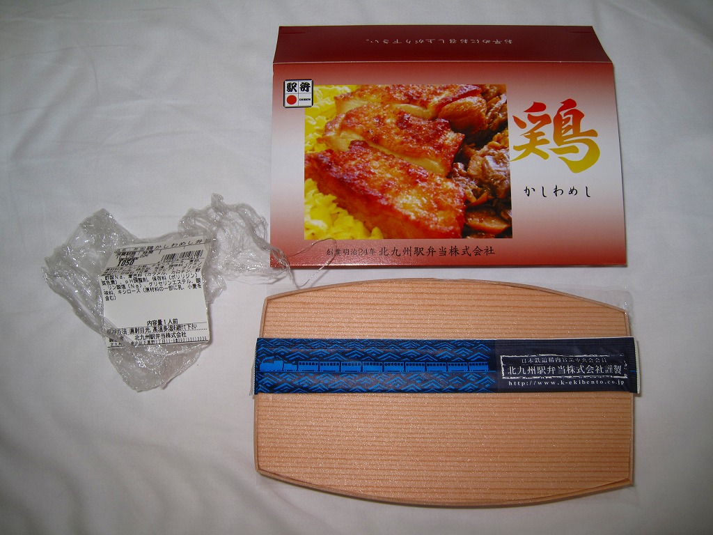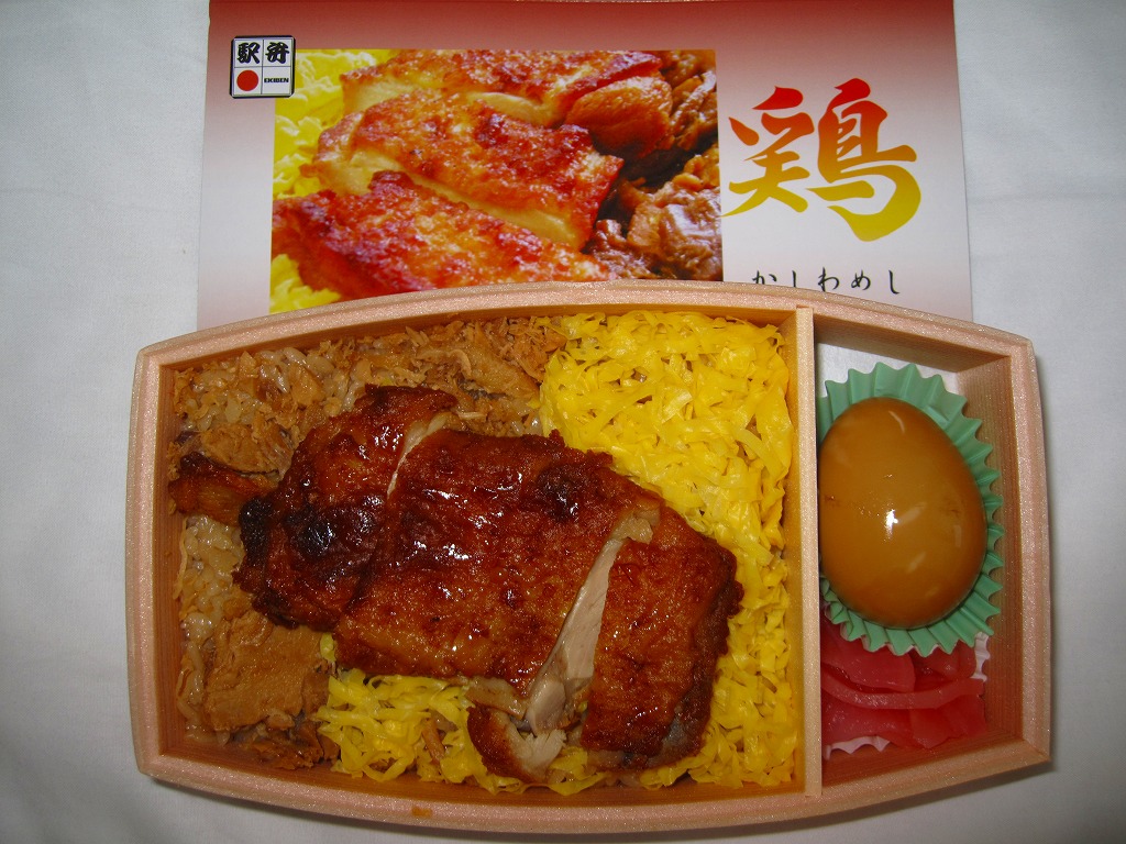 駅弁の名前にニワトリが2羽いたり、御飯の上のストライプに刻み海苔がなかったりと、これは北部九州名物のかしわめしでない感じ。しかし名古屋駅弁で見たタイプの、揚げてから切る大きな鶏唐揚の旨さは光る。伝統にこだわらないこんな見栄えや内容や味があってもよい。2013年までの販売か。