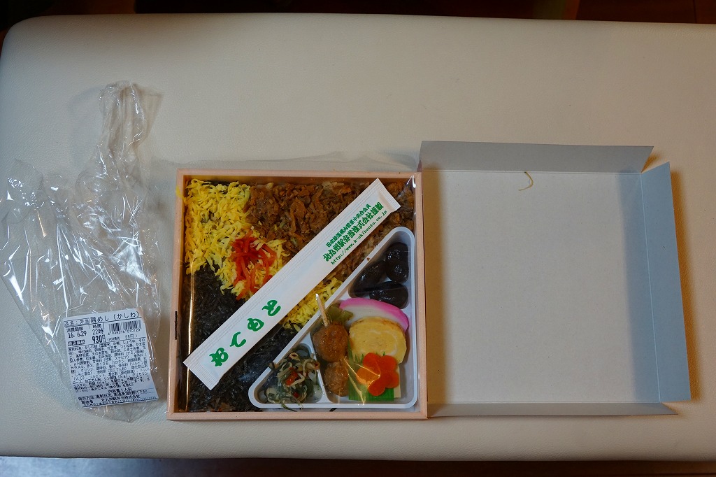 2020(令和2)年の発売か。おそらく下記の格安駅弁「かしわめし」の生まれ変わりなのではないかと思う。押寿司向けの小さな木枠に鶏炊込飯を詰めて、刻み海苔、錦糸卵、鶏フレークのストライプで覆い、紅生姜を載せて、鶏唐揚と大根桜漬を添える中身は、かしわめし駅弁として過不足ない。こんなに小さいのに、おにぎり2個分に満たない量しかないのに、ちゃんと駅弁らしくできていて面白い。この年限りの販売か。