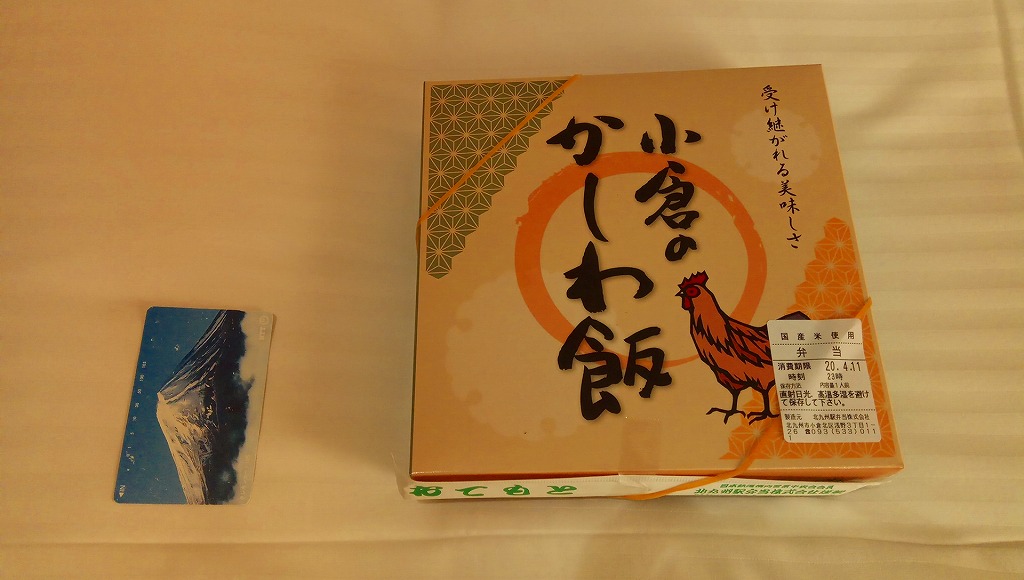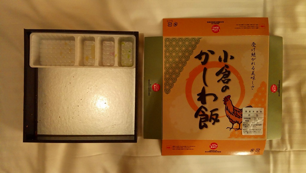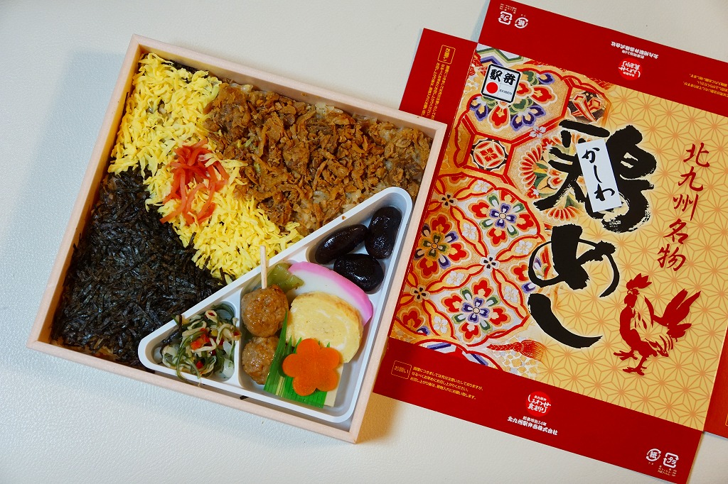 約11センチ四方の容器の中に鶏ガラスープで炊いた御飯を詰め、錦糸卵と鶏フレークと鶏照焼を貼り付ける。鶏照焼の添付を除けば内容は小倉駅弁らしいし、風味も小倉駅弁のものだが、分量に対する価格は感覚的に2割ほど高い。駅弁屋と催事屋とスーパーの三層構造でマージンがかかっていると思えば、そんなものか。