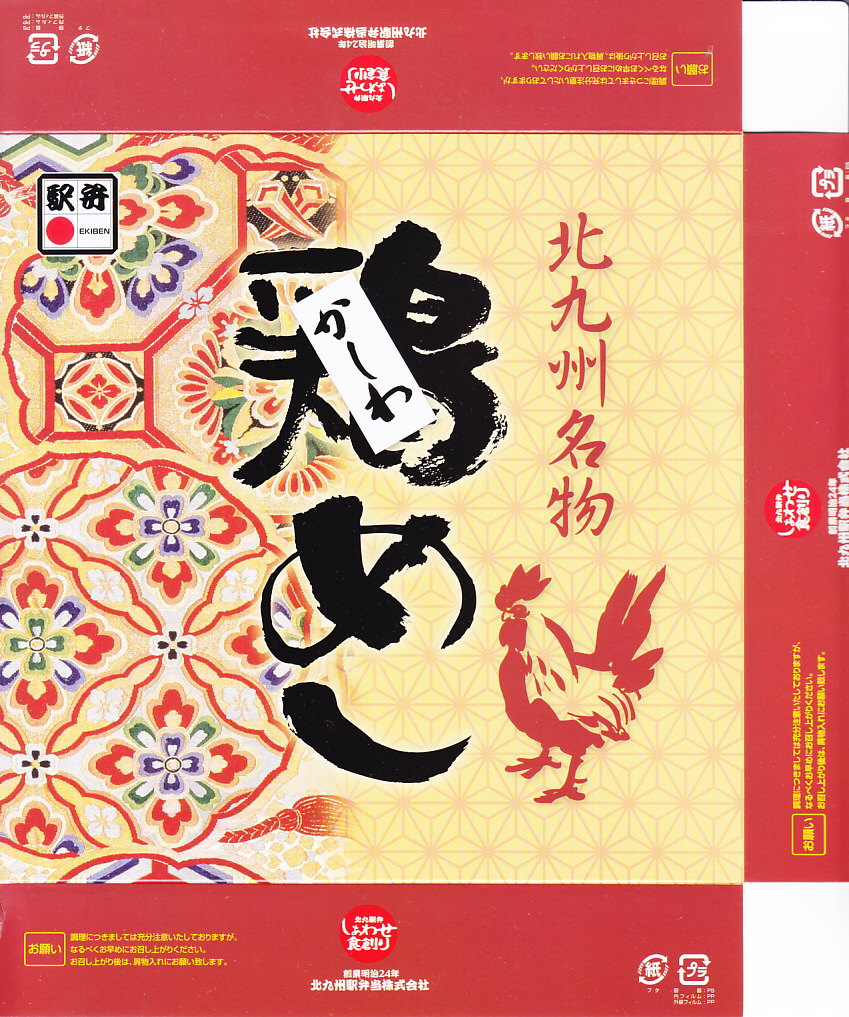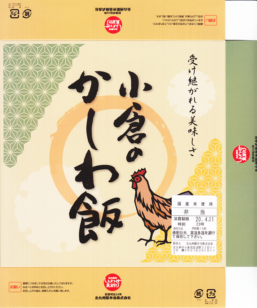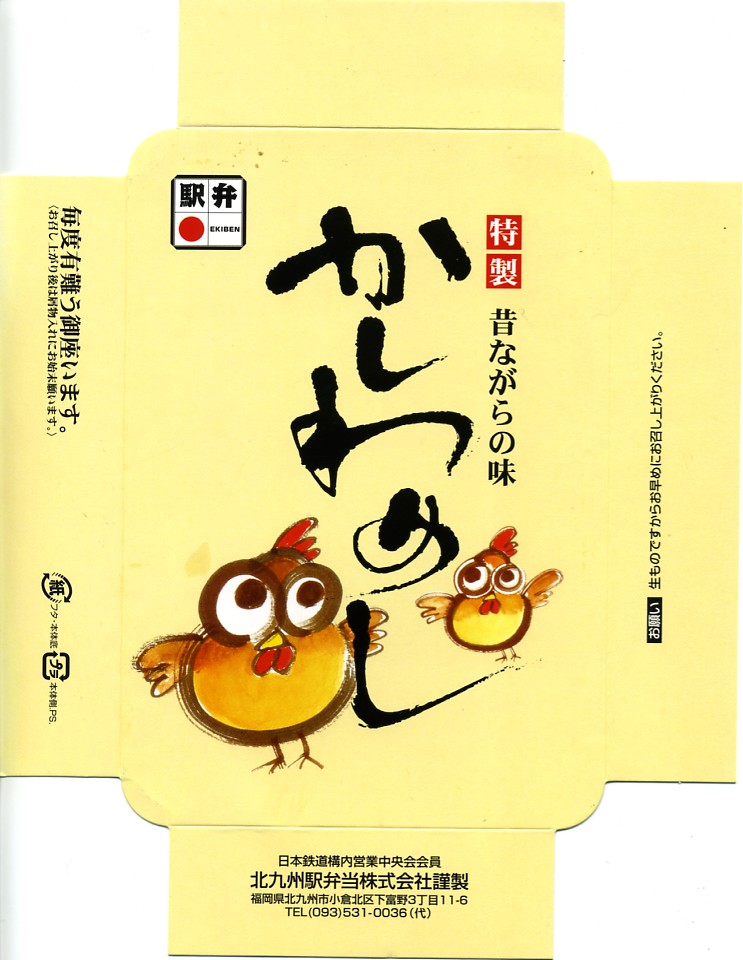 1993(平成5)年1月2日6時の調製と思われる、昔の小倉駅弁の掛紙。後の「特製かしわめし」、現在の「北九州名物鶏めし」に相当するものだろう。駅弁マークや消費税がある頃なので「昔の」とは語弊があるかもしれないが。鶏の切り絵のようなシンプルで分かりやすいデザインは、個人的には現在の物より良く見える。