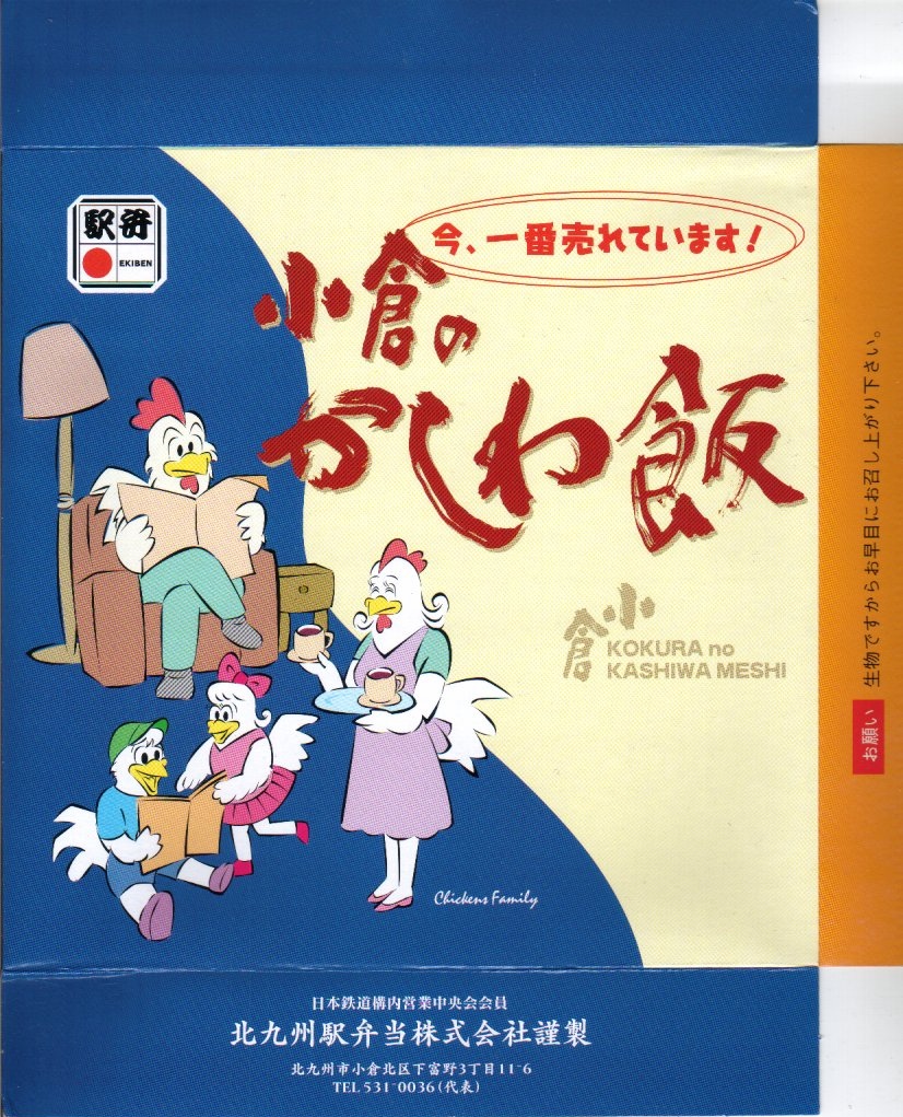 2002(平成14)年3月1日の調製と思われる、小倉駅弁の紙ふた。擬人化されたニワトリの4人家族が、家族だんらん中。中身は上記の駅弁「伝承小倉のかしわ飯」と同じ。