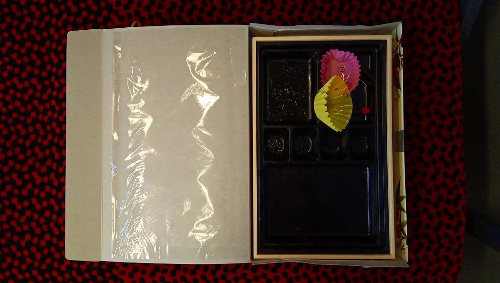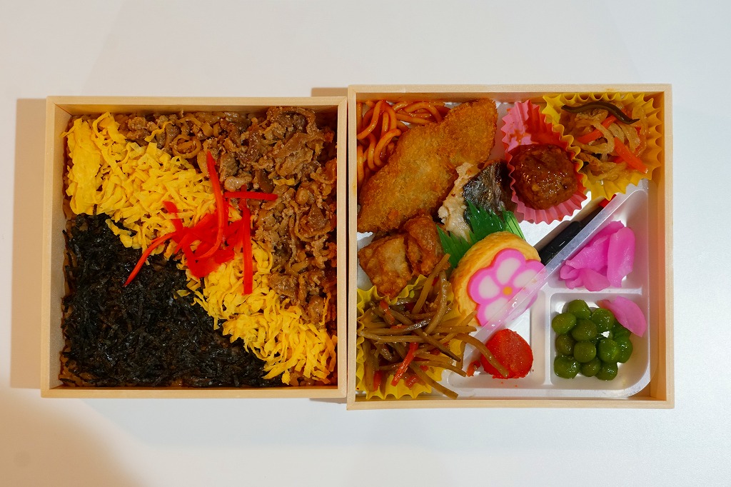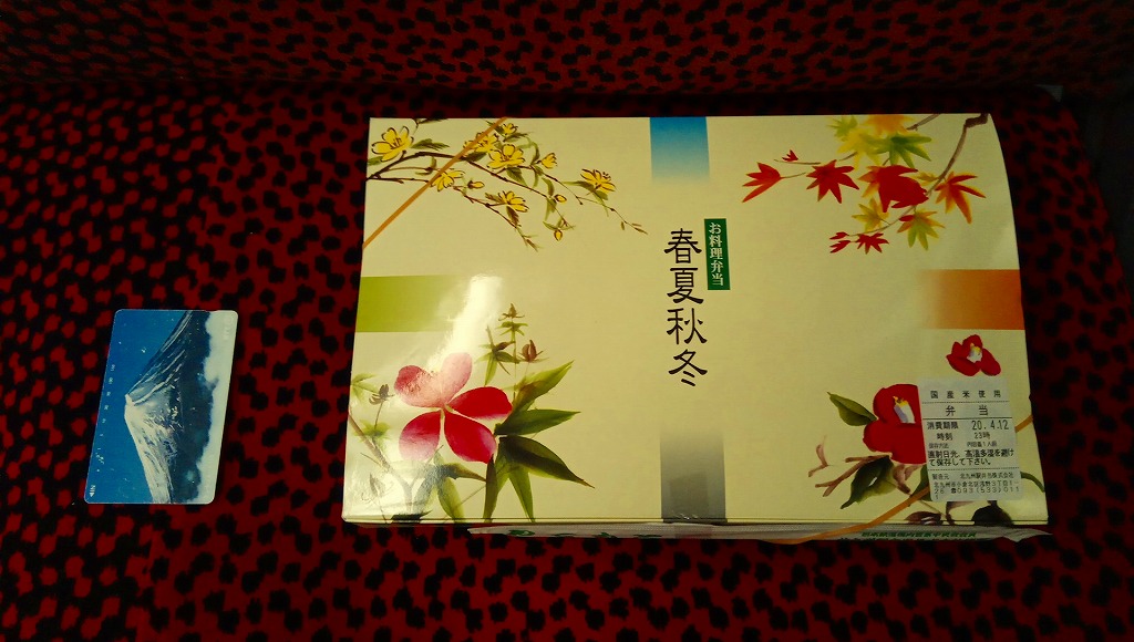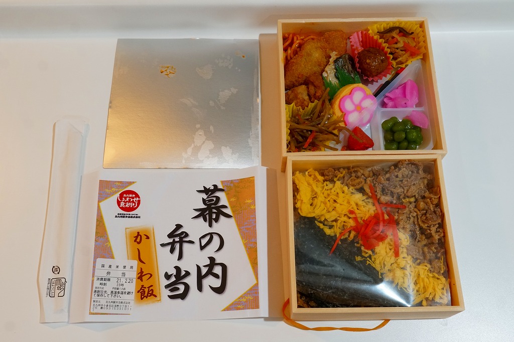 2020(令和2)年の発売か。「お料理弁当春夏秋冬」と書かれた、市販の仕出し弁当向け紙箱を使う。現物には「弁当」とあり、売場には「幕の内かしわ飯」とあった。中身の半分は、鶏炊込飯を刻み海苔、錦糸卵、鶏フレークのストライプで覆い、紅生姜を添えるかしわめし。半分は白身魚フライ、鶏唐揚、スパゲティ、切り干し大根、きんぴらごぼう、花かまぼこ、玉子焼のおかず。その間に、辛子明太子、みかん、大根桜漬、うぐいす豆の付合せ。こうして記せば、いろんなものが入っている。しかし乱雑な見栄えは、まるで場末のスーパーのお惣菜