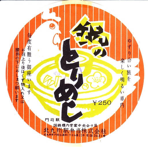 昭和50年代、1980年前後の、3月10日10時の調製と思われる、昔の小倉駅弁の掛紙。この「鍋のとりめし」は、当時に甲府駅や黒磯駅などの駅弁にも使われていた鍋形の陶器に、鶏ガラスープで炊いた御飯を詰め、とりそぼろ、玉子そぼろ、刻み海苔の3色で覆う、人気の駅弁だった。