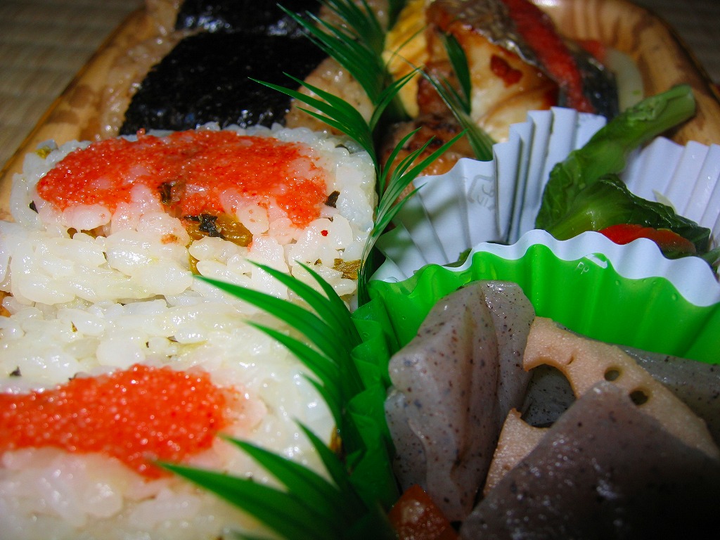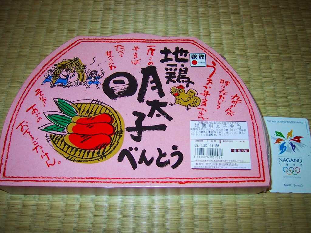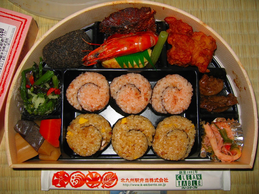 発泡材でできた大きめの半円形の容器を、明太子色のボール紙で包む。中身は中央に明太子の海苔巻きとかしわの親子海苔巻きを3つずつ置いて、その周囲を海老に唐揚げに煮物に鱒の焼き魚に玉子焼きにと多種多様なおかずが囲む。外観や駅弁の名前に反して明太子を使ったものはごくわずかで、大部分は全然辛くないから、私のような辛いものが苦手な人でも大丈夫。高めの値段相応の味と内容で「そりゃー あごの おちるごたーけん」。