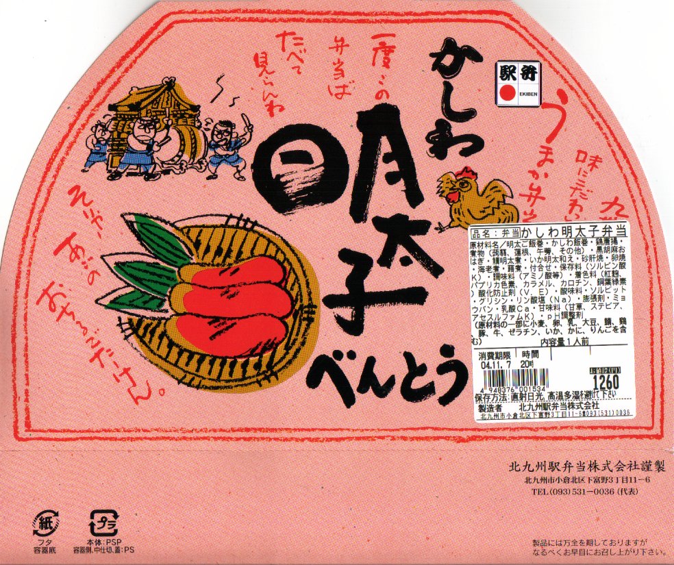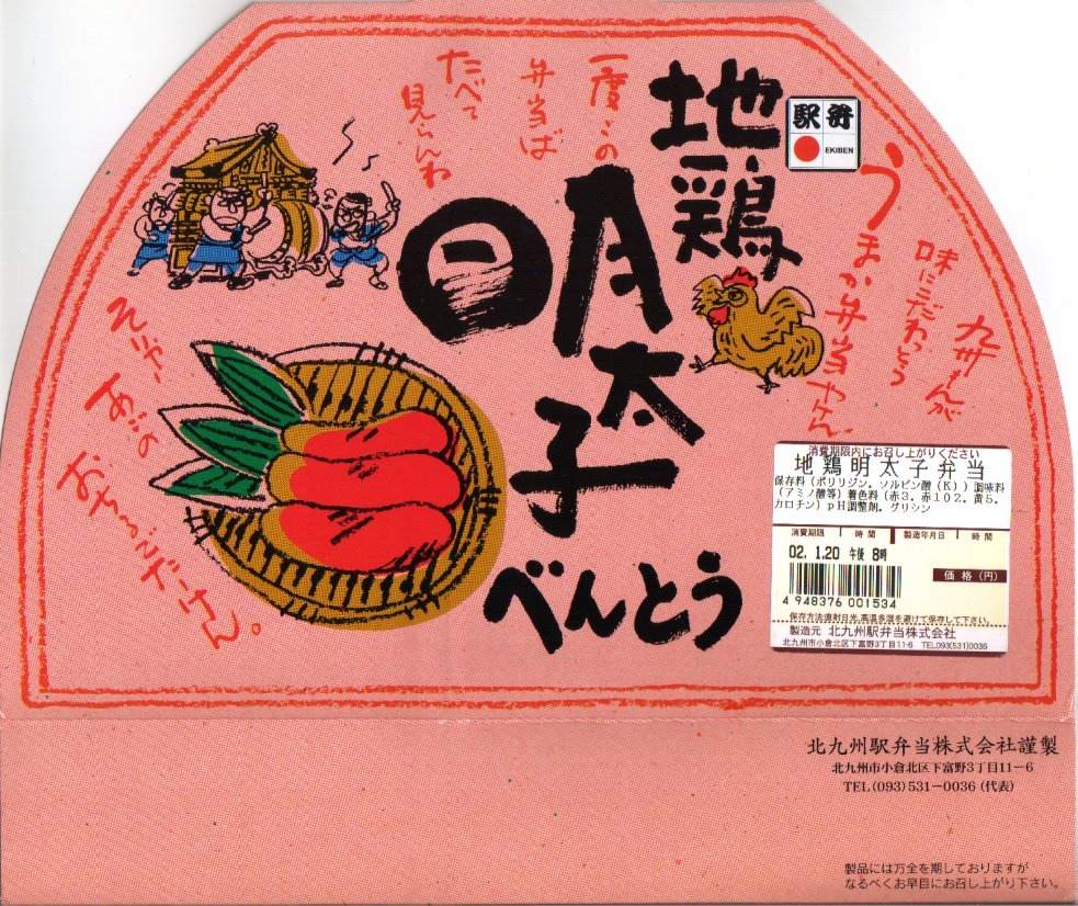 価格も中身も容器も調製元も風味も、下記の駅弁「地鶏明太子べんとう」とまったく同じで、駅弁の名前だけ異なる。おそらく、2002年の牛肉産地偽装事件などを受けて農林水産省が厳格化した、2004年9月改正の加工食品品質表示基準に基づいて、名前を変更したものと思われる。食品や包装に関する表示のルールが、国により漸増的に五月雨式に増強され強化され続け、駅弁屋も泣いていると思う。2年半の違いで食品表示シールの情報量も激増している。2009年頃までの販売か。