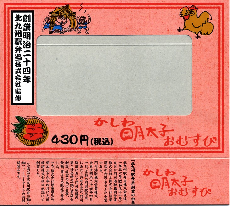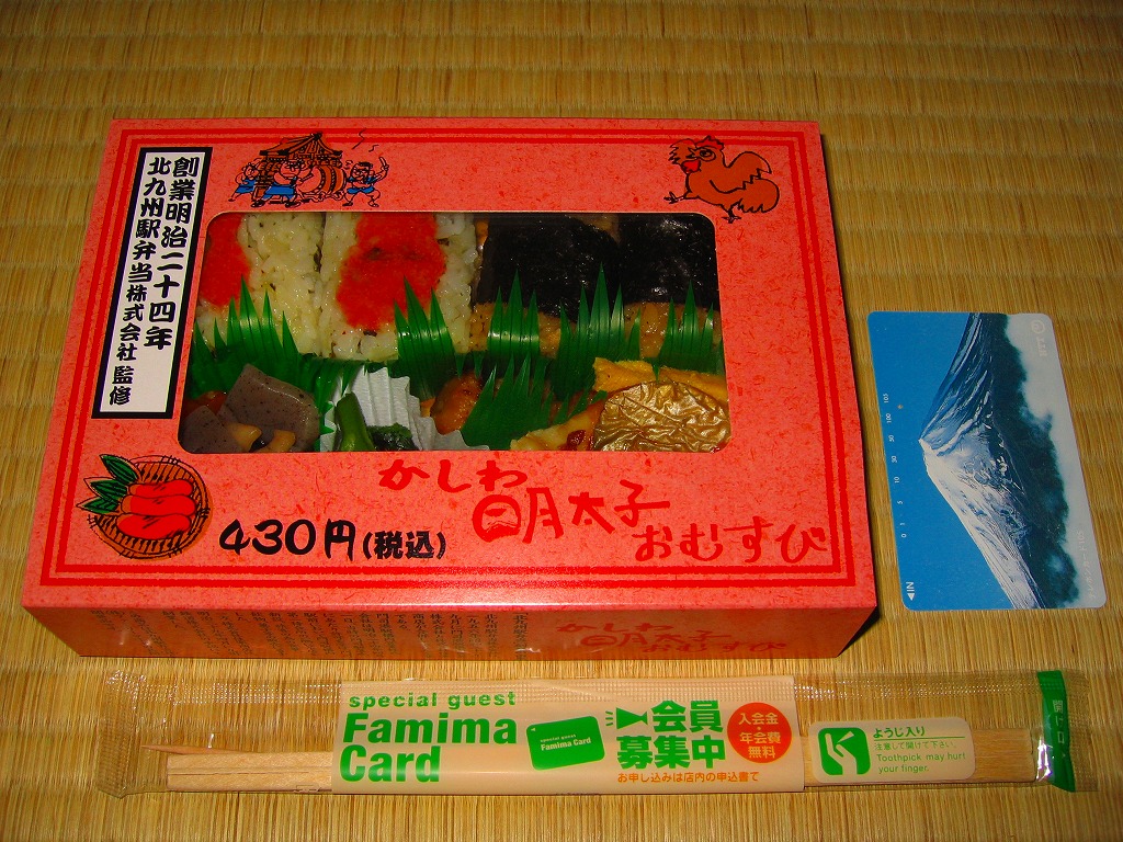 北九州駅弁当の監修により、2006(平成18)年2月21日から3月6日まで、コンビニ大手のファミリーマートの全国各地の店舗で販売された商品。明太子色の紙枠に収まった竹皮柄のプラ製トレーに、かしわの俵飯が2個と明太子の高菜俵飯が2個、小さな焼サバにも明太子がかかり、やはり小さな卵焼きや鶏肉や煮物など。