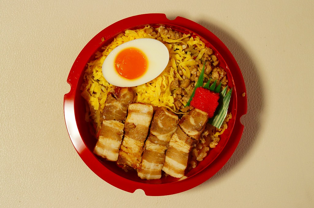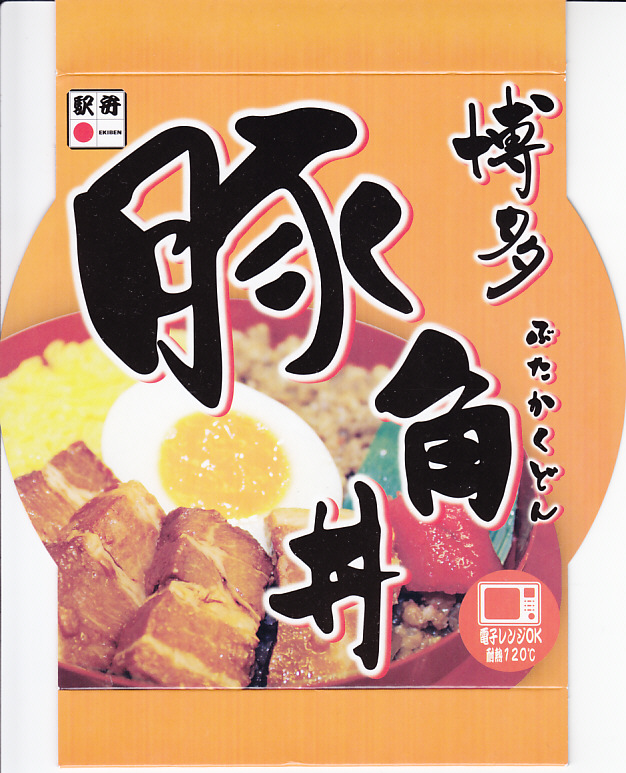 2013(平成25)年10月までに発売。同年のJR九州の駅弁キャンペーン「第10回九州駅弁グランプリ」にエントリー。他駅の駅弁でも使われる赤い釜型プラ容器を、商品名と中身の写真だけでデザインしたスリーブにはめる。中身は豚でなく鶏の炊込飯を、豚角煮、豚そぼろ、錦糸卵で覆い、小さな煮玉子と明太子を添えるもの。鶏飯はかしわめしの御飯を流用したのだろう、全体的にかなりのやっつけ感。または、シンプルで分かりやすい中身と味。2016年までの販売か。
