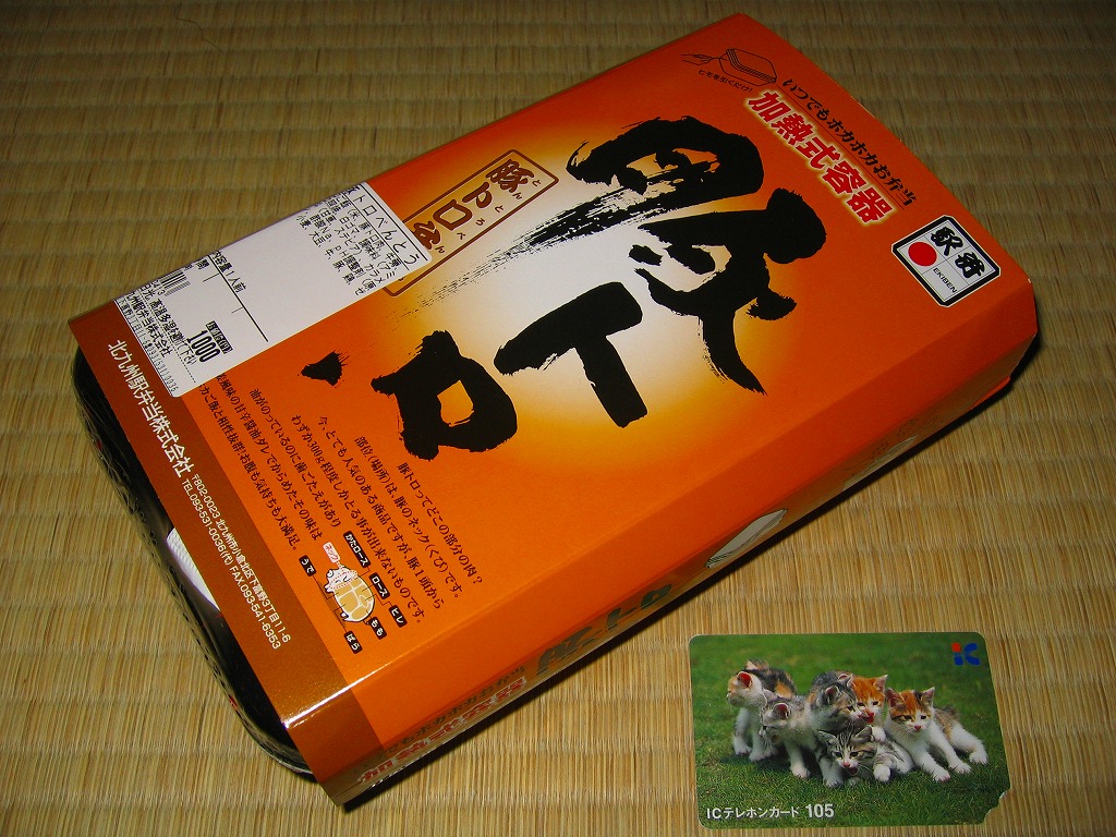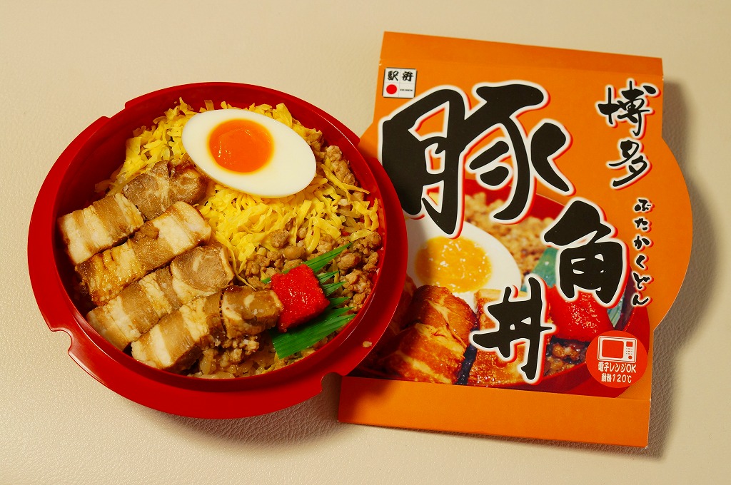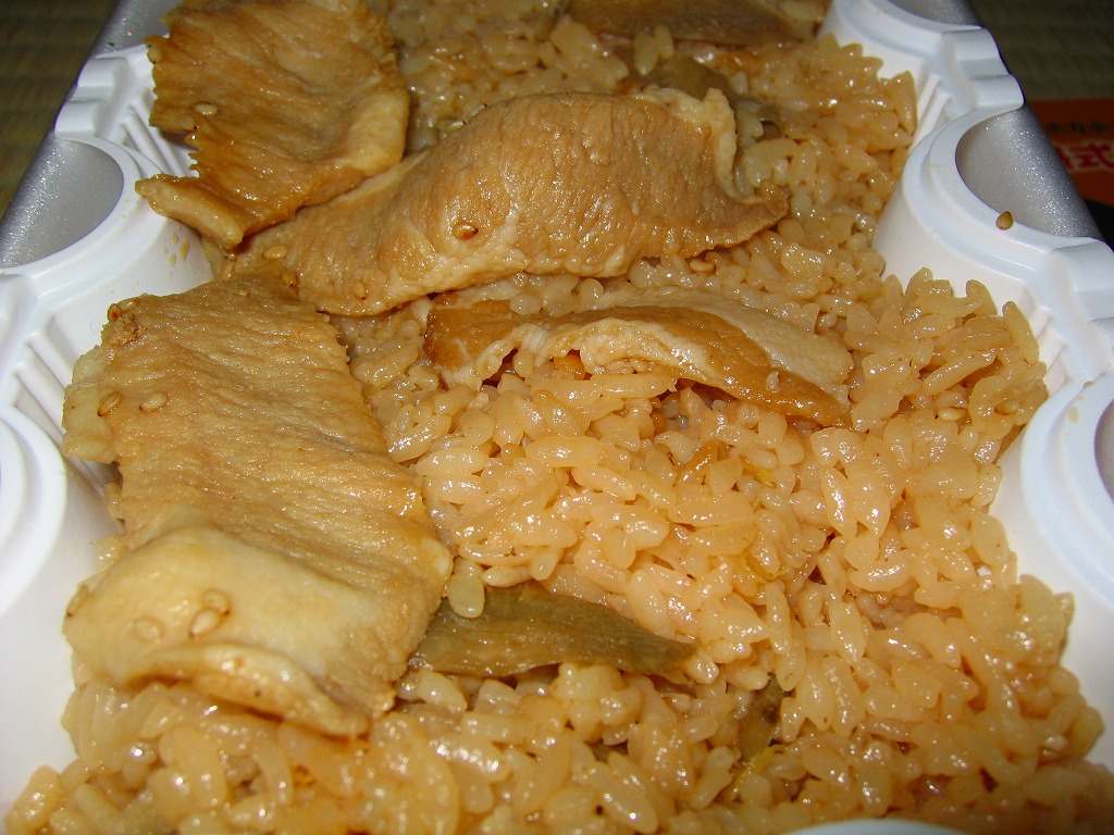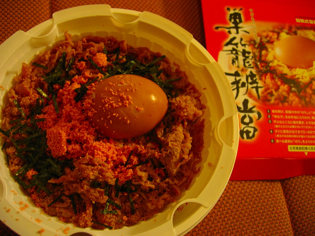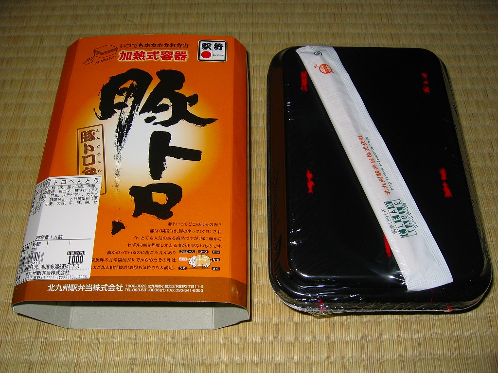 2004(平成16)年頃に発売か。長方形の加熱機能付き容器をオレンジ色のボール紙枠にはめる。中身は豚トロ御飯に豚トロ照焼が数個載るだけの、寂しいくらいシンプルな内容。味もパッケージ記載「油がのっているのに歯ごたえがあり」というよりは、にゅるにゅるしてるのに筋が硬くて噛み切れないという感じ。これが好きな人は好きだろうが、販売面では苦戦するタイプか。数年間で売り止めたのではないだろうか。