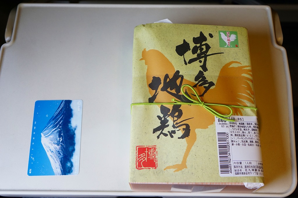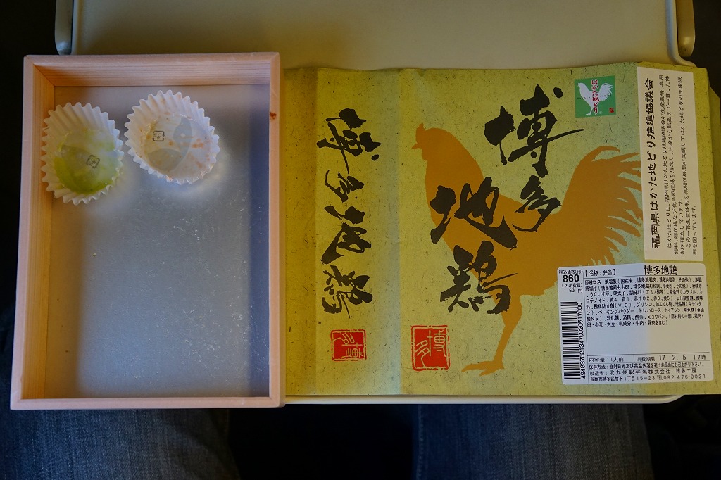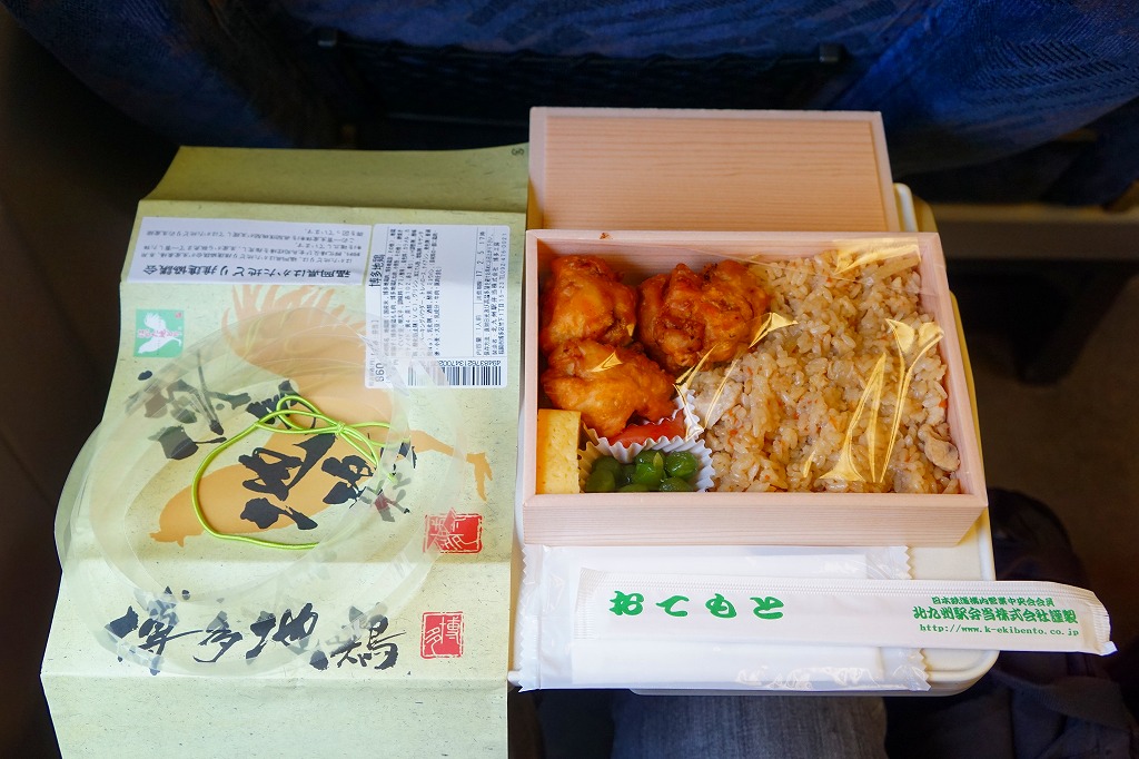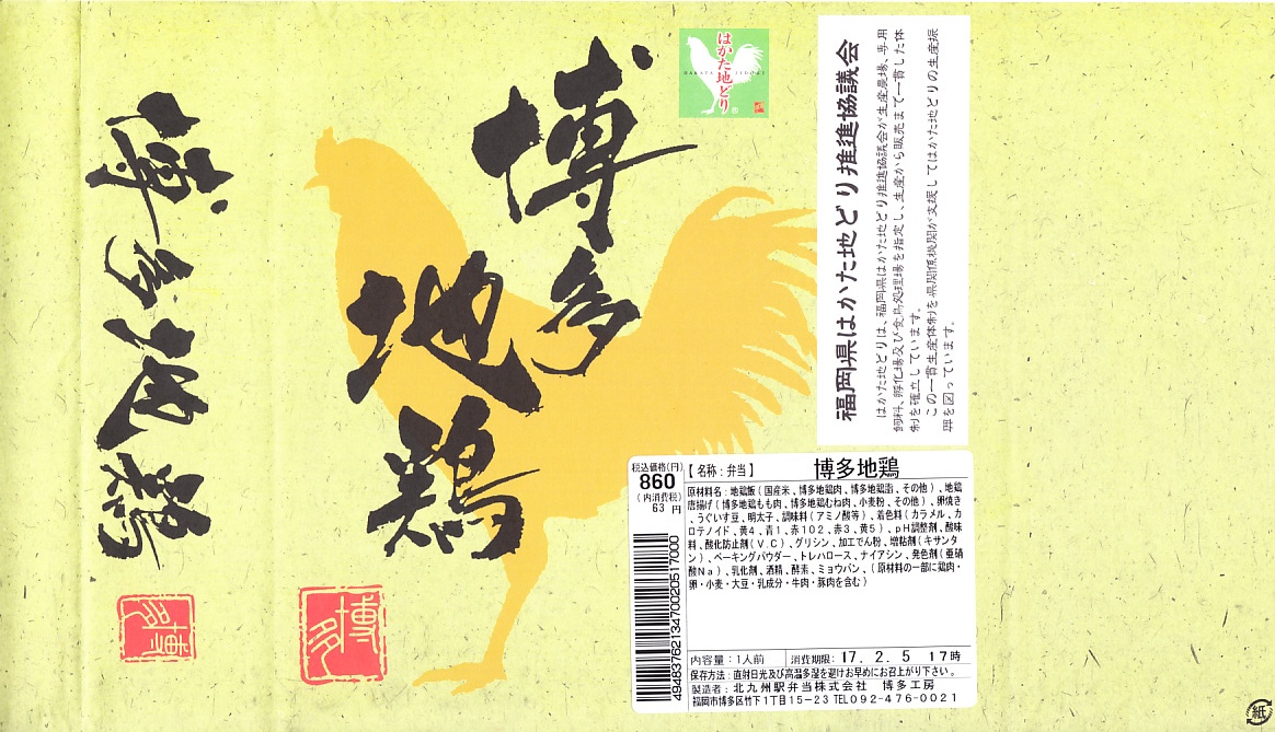 小倉駅の駅弁屋が調製し、小倉駅の駅弁売店で買えた弁当。しかし同社の駅弁に印字する駅弁マークがないなど、見栄えがなんとなく駅弁っぽくないし、商品名も小倉っぽくない。小柄で四角い容器に鶏飯を詰め、鶏唐揚3個、玉子焼、明太子、うぐいす豆を添えるシンプルな内容。原材料に博多地鶏あるいは「はかた地どり」を使うようだ。この姿と内容では、2016年頃から2017年頃までの販売か。