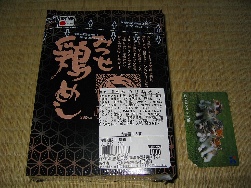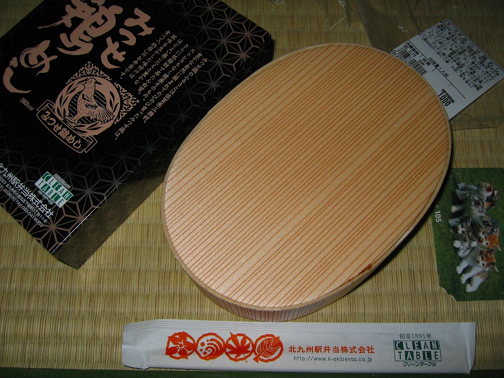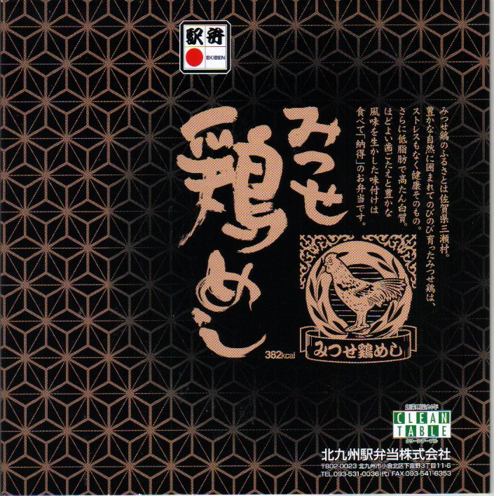 2004(平成16)年4月10日に発売。木目調で楕円形の容器を、真っ黒なボール紙の箱に詰める。中身はつまり鶏めしだが、鶏御飯に鶏のぶつ切りもも照焼を載せるスタイルは、大館駅の名物駅弁「鶏めし弁当」に似ており、鶏肉の品質に絶対の信頼を置いていることを表していると思う。高価で少量でも、冷蔵の状態でも締まりの良い風味や食感を感じられる。九州北部の鶏飯駅弁なのにかしわめしを名乗らないのは、「みつせ」鶏めしではなく「みつせ鶏」めしであるためか。2005年までの販売か。