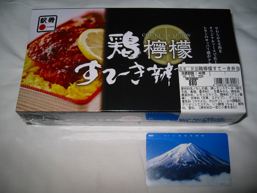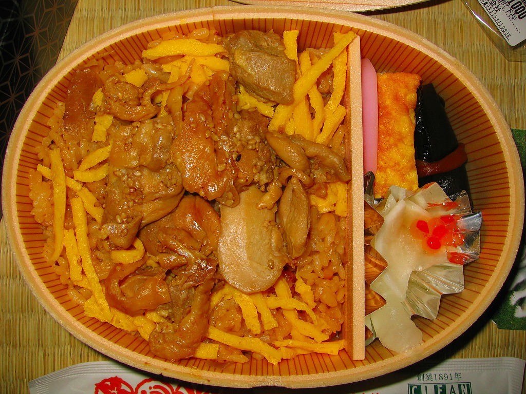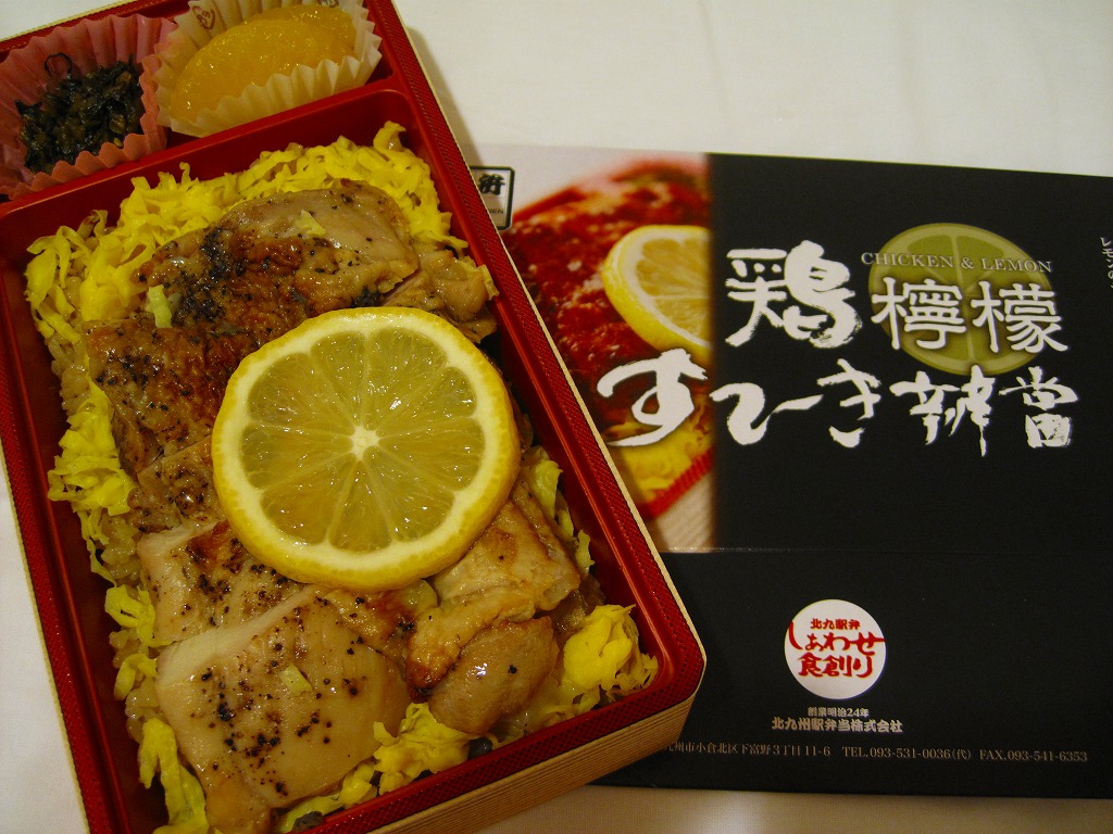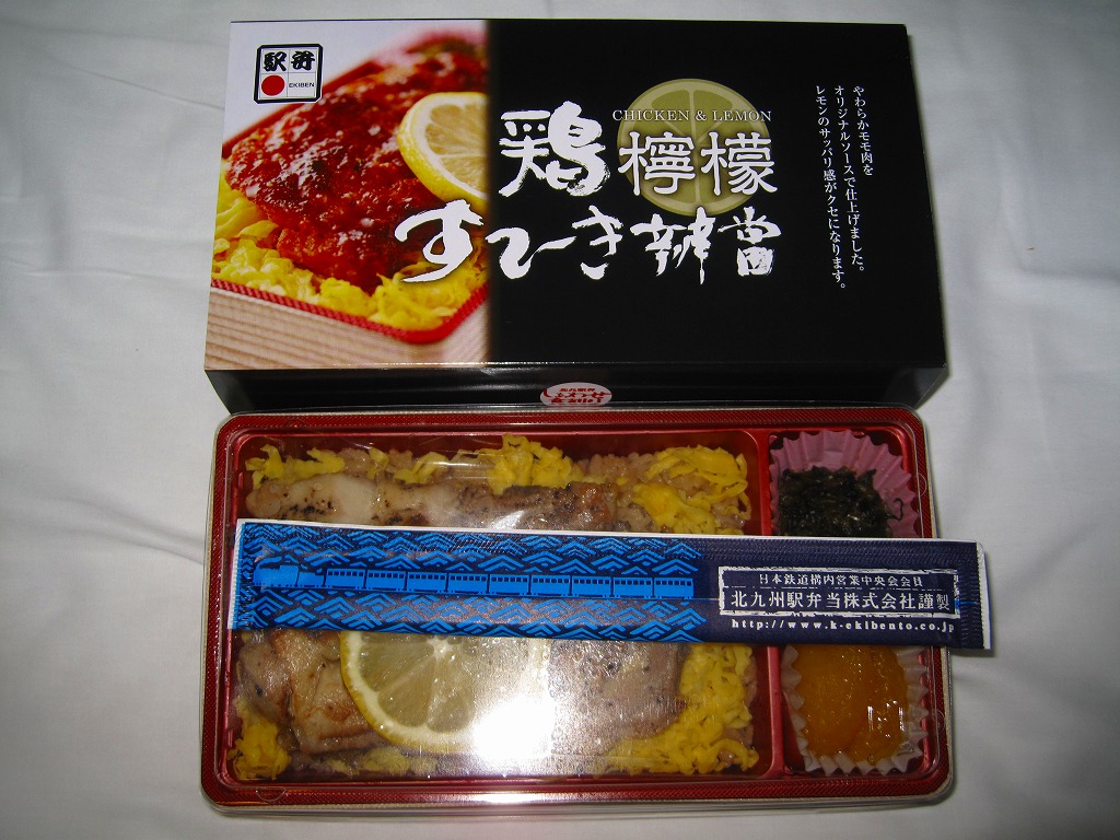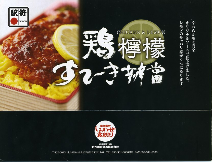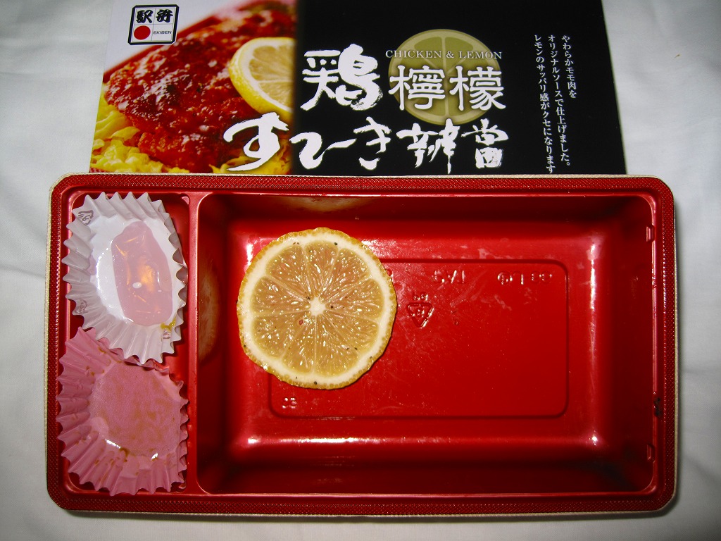 2009(平成21)年の秋に発売か。赤いトレーを接着した長方形の発泡材枠用意に透明なふたをして、中身の写真と商品名を美しく描いたボール紙の枠にはめ、ラップでまるごと包んで食品表示ラベルを貼る。中身は茶飯の上に錦糸卵を敷き、鶏レモンステーキなる、鶏もも肉をコショウで焼いてレモンの風味とスライスを付けたものが1個載せ、高菜炒めと甘夏みかんを添えるもの。