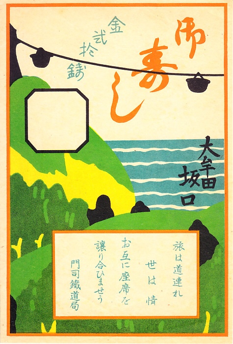おそらく1930年代の調製と思われる、昔の大牟田駅弁の掛紙。地名のみから有明海の三池港へ石炭を輸送する索道を想像したが、こんな風景が現地にあったのかどうか。調製元の坂口は1900年代までには大牟田駅で駅弁を販売、1942年に久留米、鳥栖、大牟田、日田の構内営業者が合同し中央軒となり、1950年に離脱のち廃業、その後の大牟田中央軒に引き継がれたという。