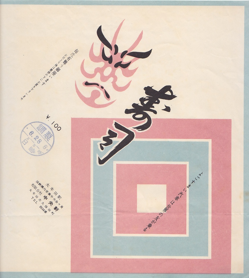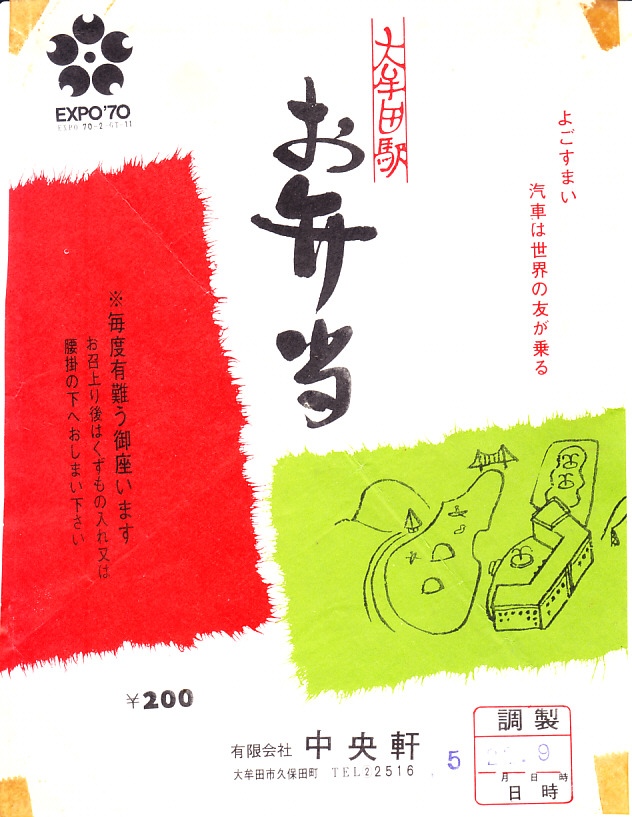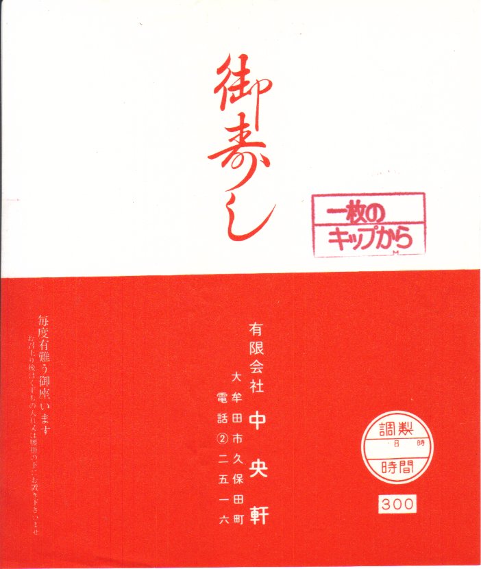 1960年代の、6月28日8時の調製と思われる、昔の大牟田駅弁の掛紙。掛紙に歌舞伎の隈取を描いた寿司という駅弁は、当時は日本全国にあった。調製元の中央軒は鳥栖駅弁の中央軒と、1942年に合併し1950年に解散した間柄であり、1980年代までに大牟田駅弁を名乗ったうえで、2007年まで駅弁を販売した。