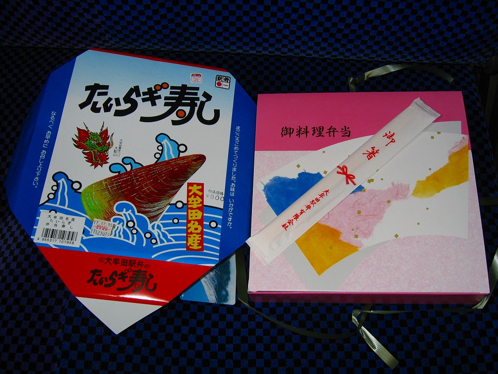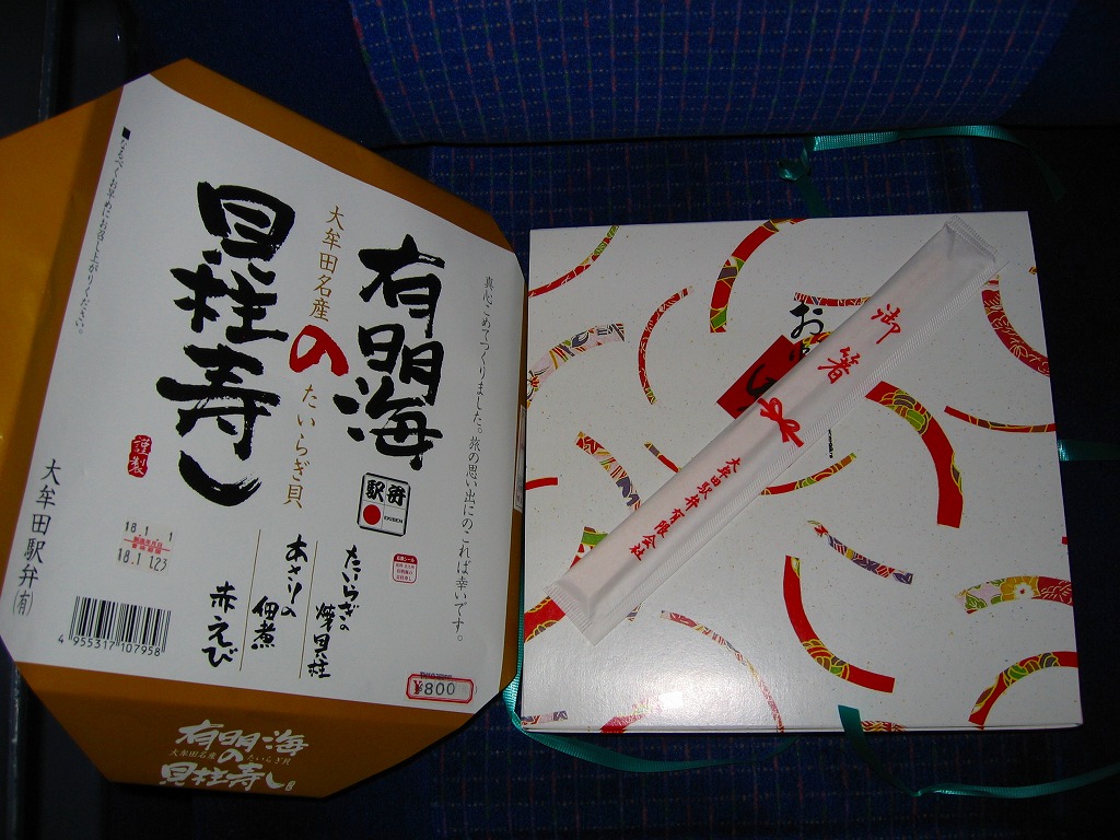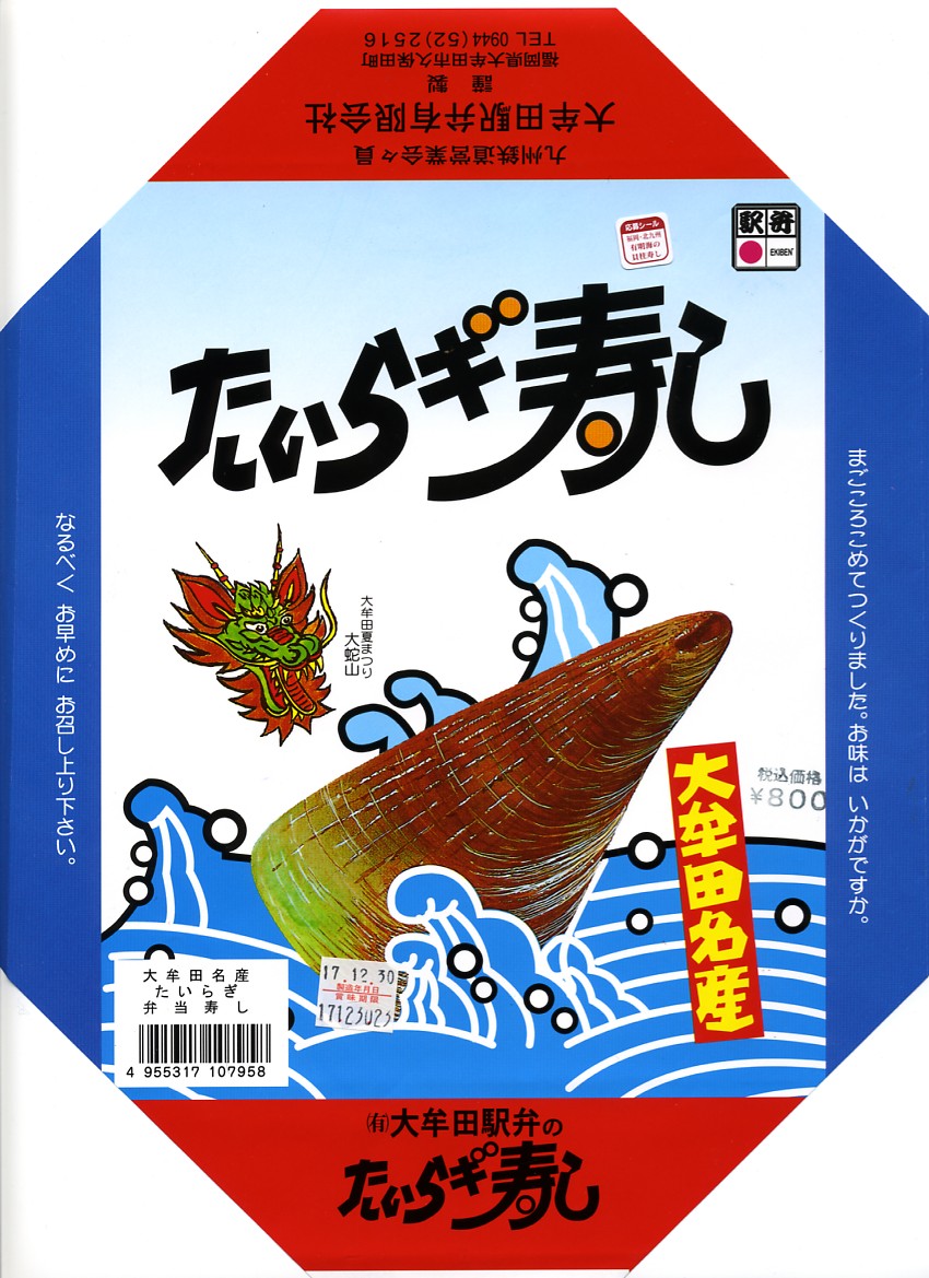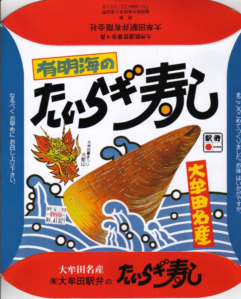 1999(平成11)年4月18日に購入した、昔の大牟田駅弁のパッケージ。2002年のものと絵柄はだいたい同じでも、構造がまるで異なる。大牟田の駅弁はかなり頻繁に容器を変更したようで、「たいらぎ寿し」「幕の内弁当」とも、ネット上で様々な形状での収穫報告がみられた。