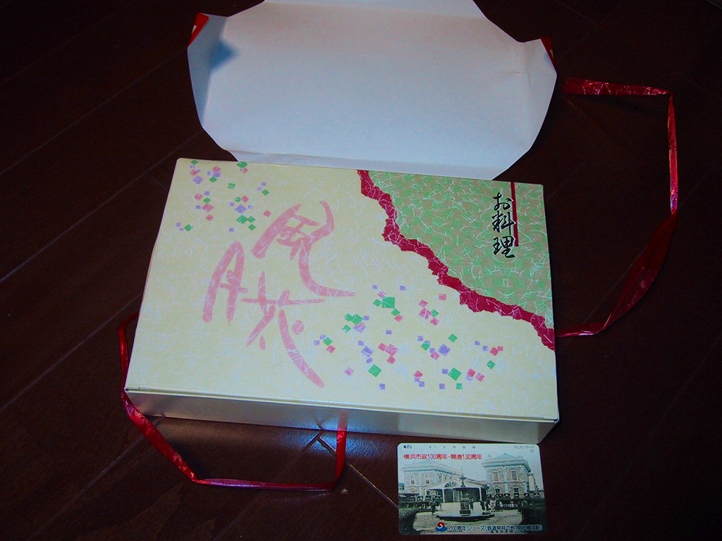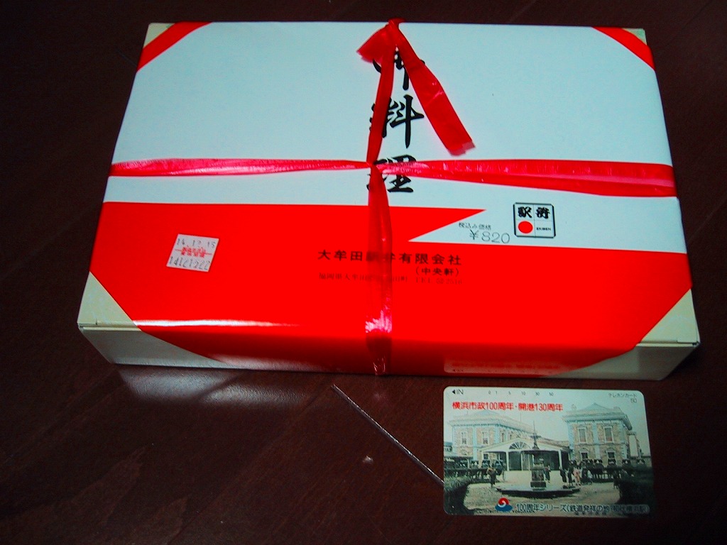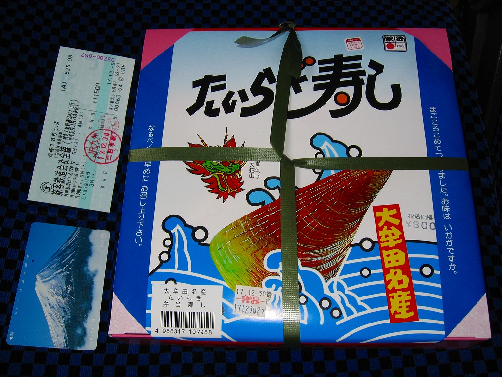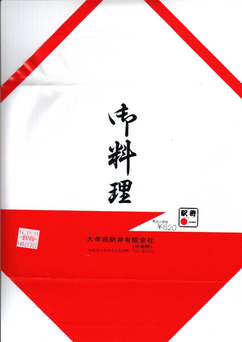 1999(平成11)年4月18日に購入した、昔の大牟田駅弁のパッケージ。2002年のものと絵柄はだいたい同じでも、構造がまるで異なる。大牟田の駅弁はかなり頻繁に容器を変更したようで、「たいらぎ寿し」「幕の内弁当」とも、ネット上で様々な形状での収穫報告がみられた。