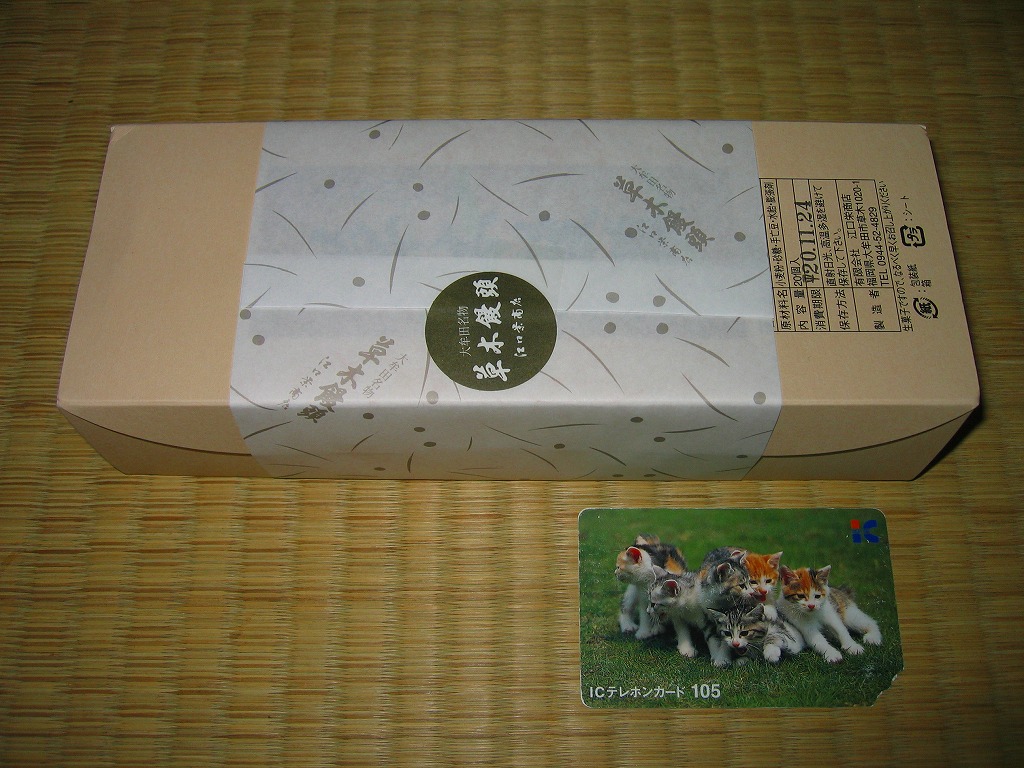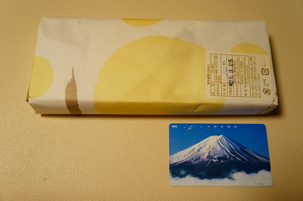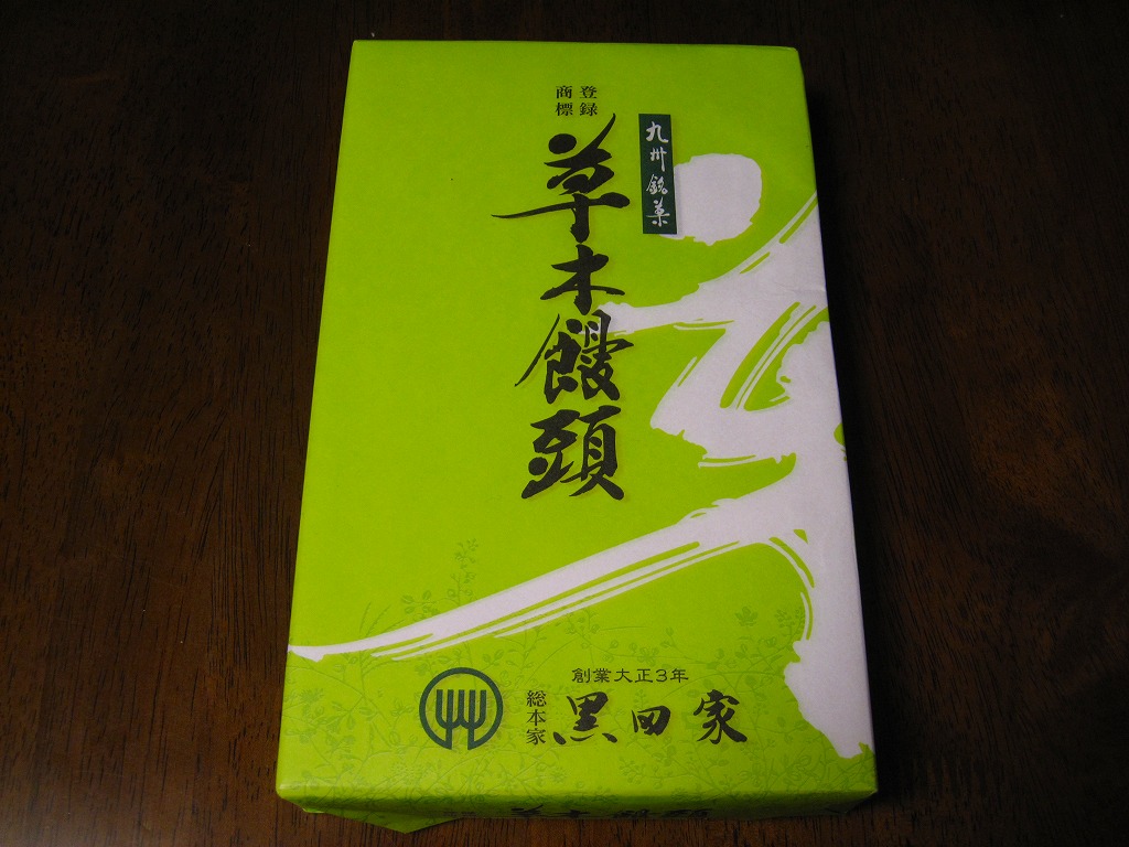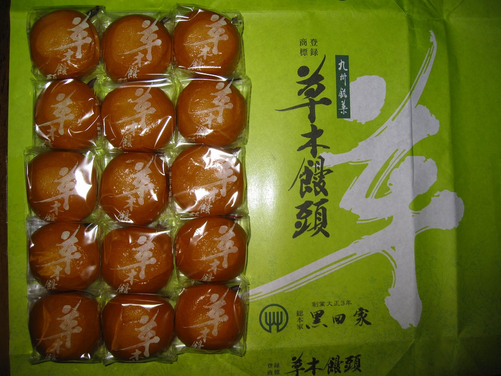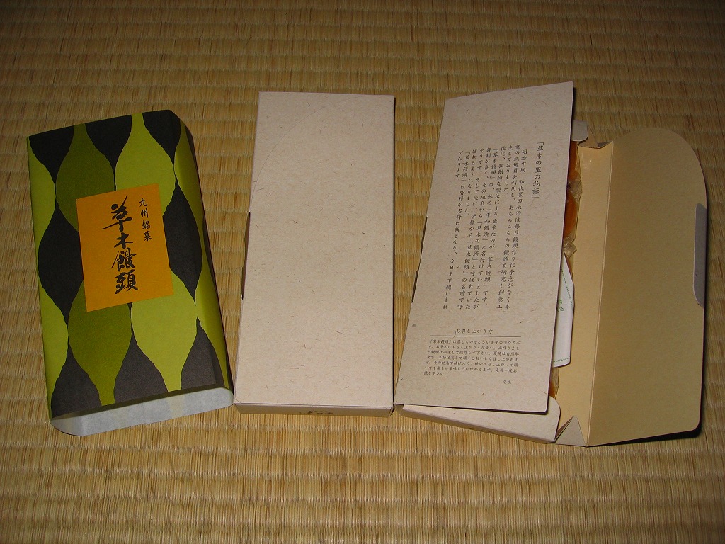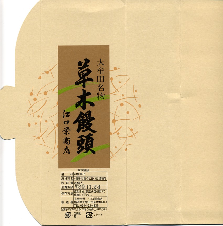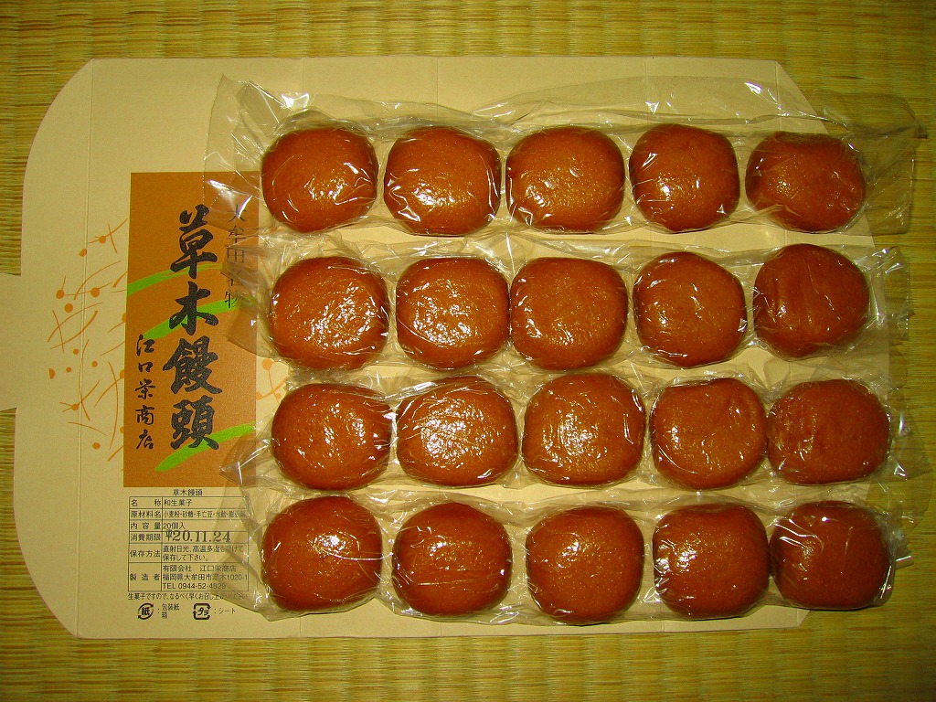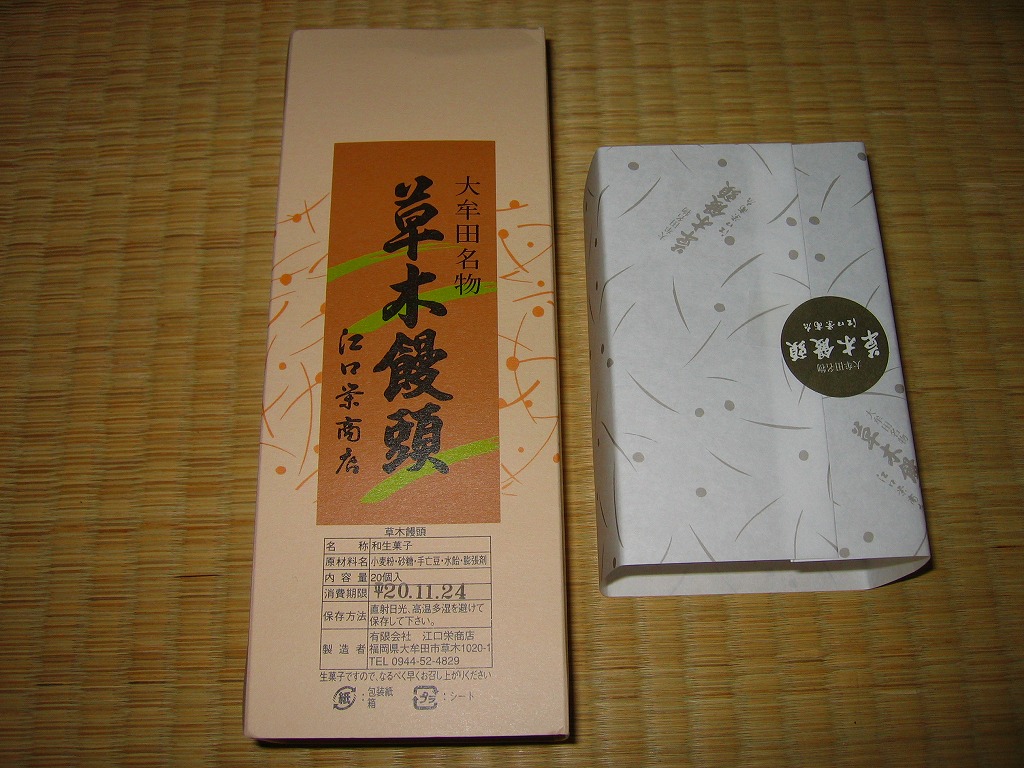 大牟田銘菓な草木饅頭の江口栄商店(えぐちさかえしょうてん)バージョンで、2008年当時で駅のキヨスクで売られていたのはこちら。黒田家版とは見た目で容器も中身も間違い探しの範囲でしか違いがないし、値段も同じ。九州名物を名乗るあちらとは対照的に、こちらは正直に「大牟田名物」と記す。