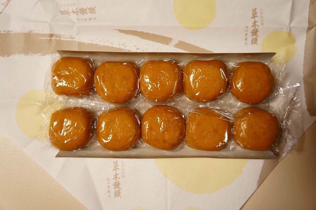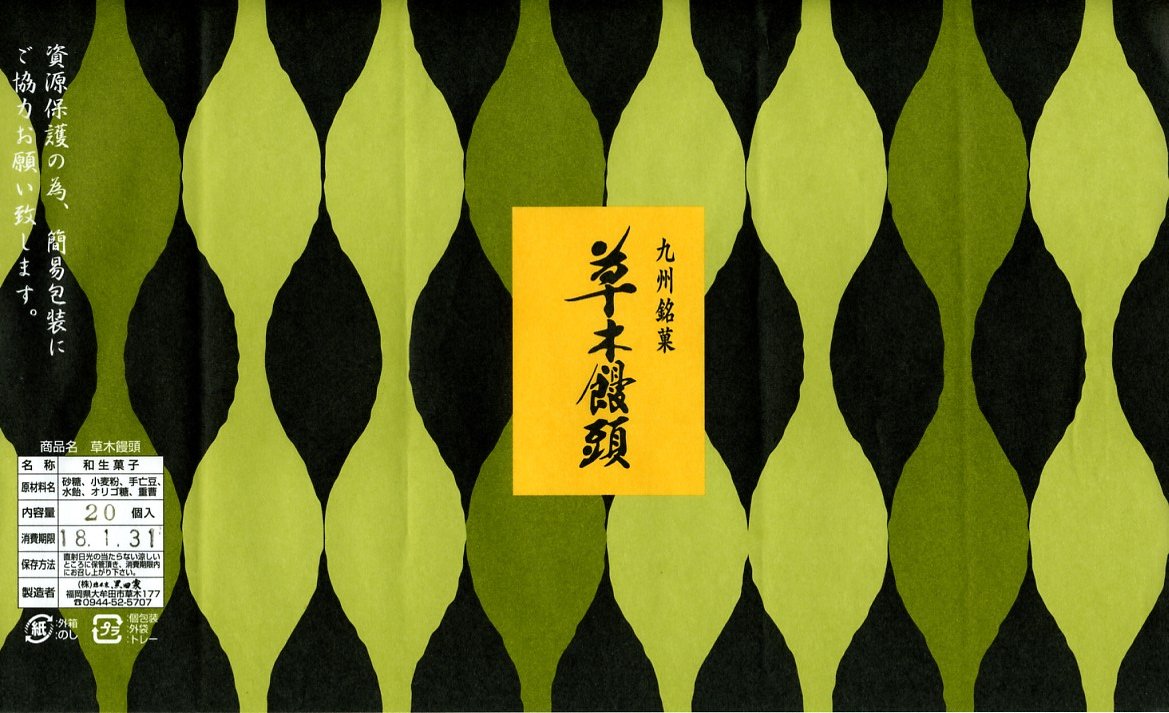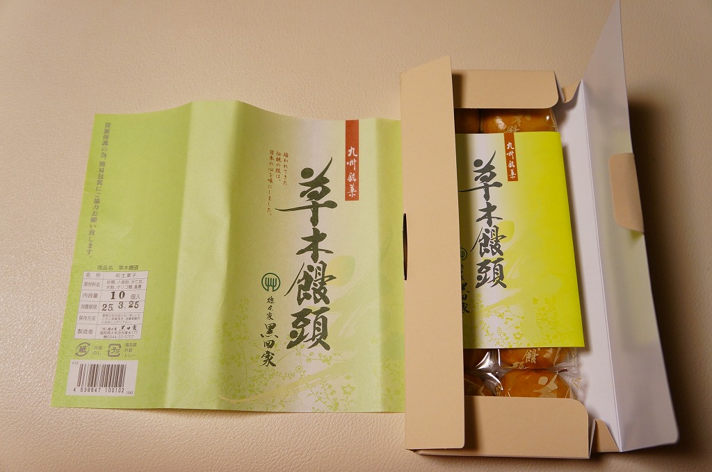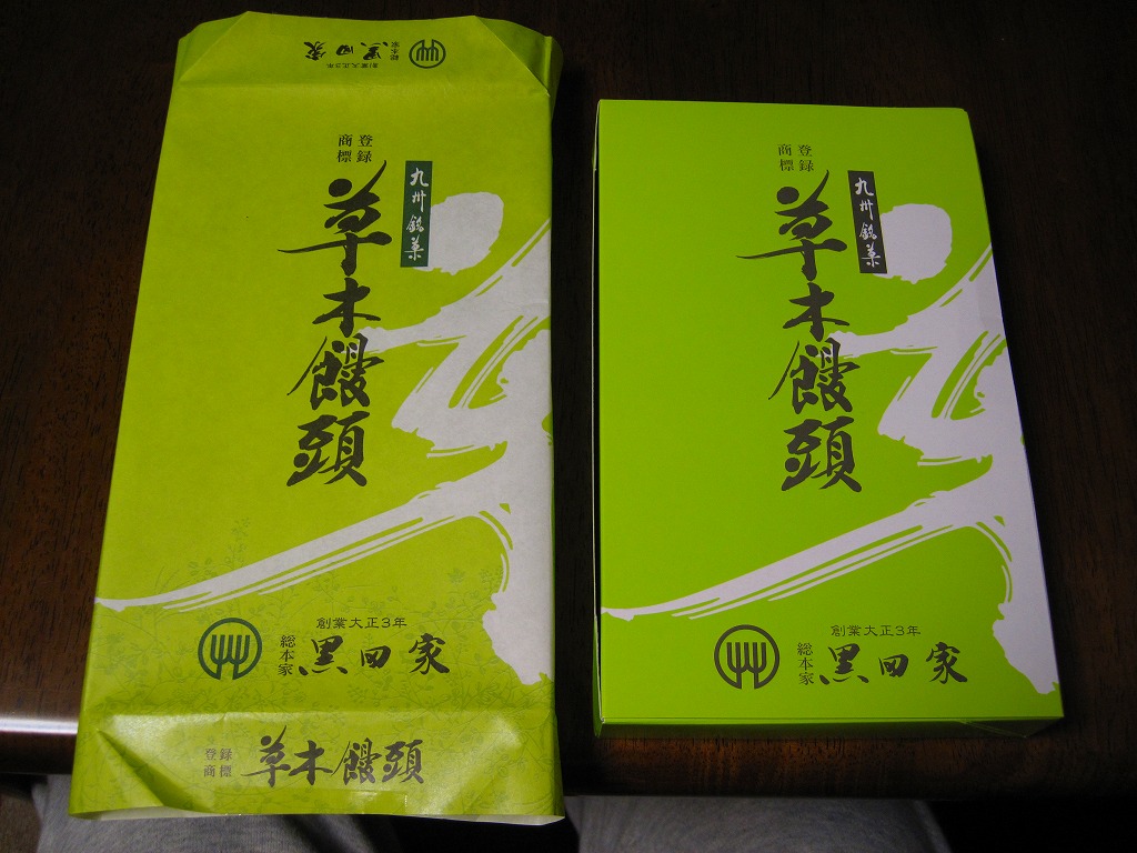 黒田の草木饅頭の10個入り。飾らず変わらない江口と異なり、包装紙の柄がまた変わり、しかし個別包装の中身は変わらない。在来線の大牟田駅での販売はなくなっても、駅前に店舗があるのでそこで買える。江口の店舗も隣にあり、両者まとめて買える。
