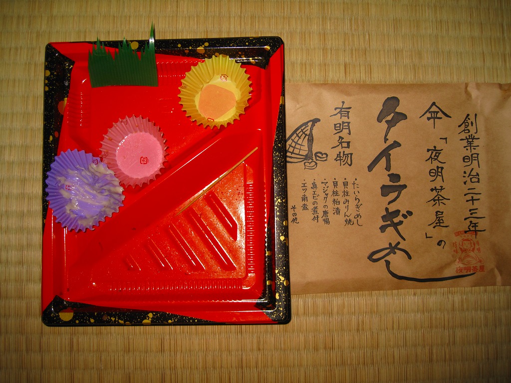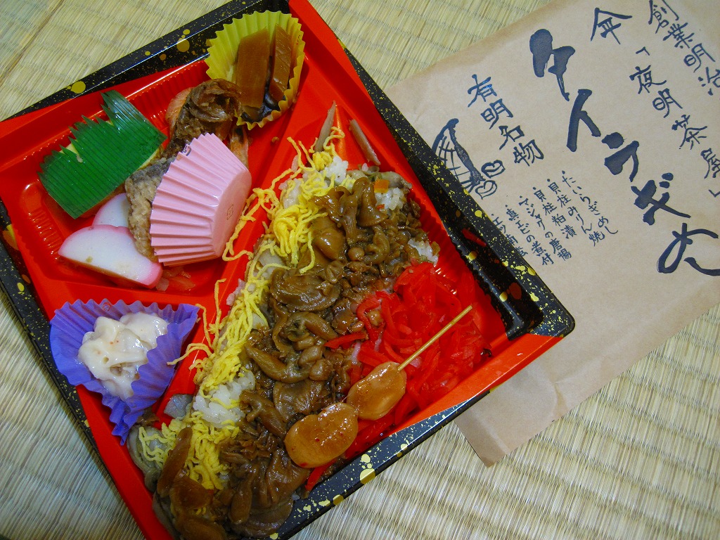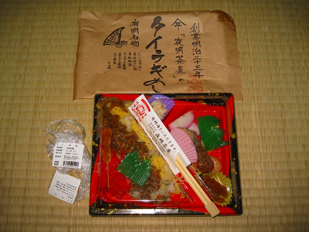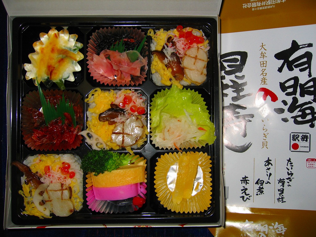 2011(平成23)年3月12日の新大牟田駅の開業日に、駅のキヨスクで売られていたお弁当。四角く平たい惣菜向けプラ製トレーに透明なふたをかけ、商品名とお品書きを印刷した茶色い掛紙で包む。中身は錦糸卵と貝ひもと紅生姜でストライプを描くタイラギの御飯と、マジャク唐揚、真エビ煮付け、エツ南蛮、貝柱粕漬など。