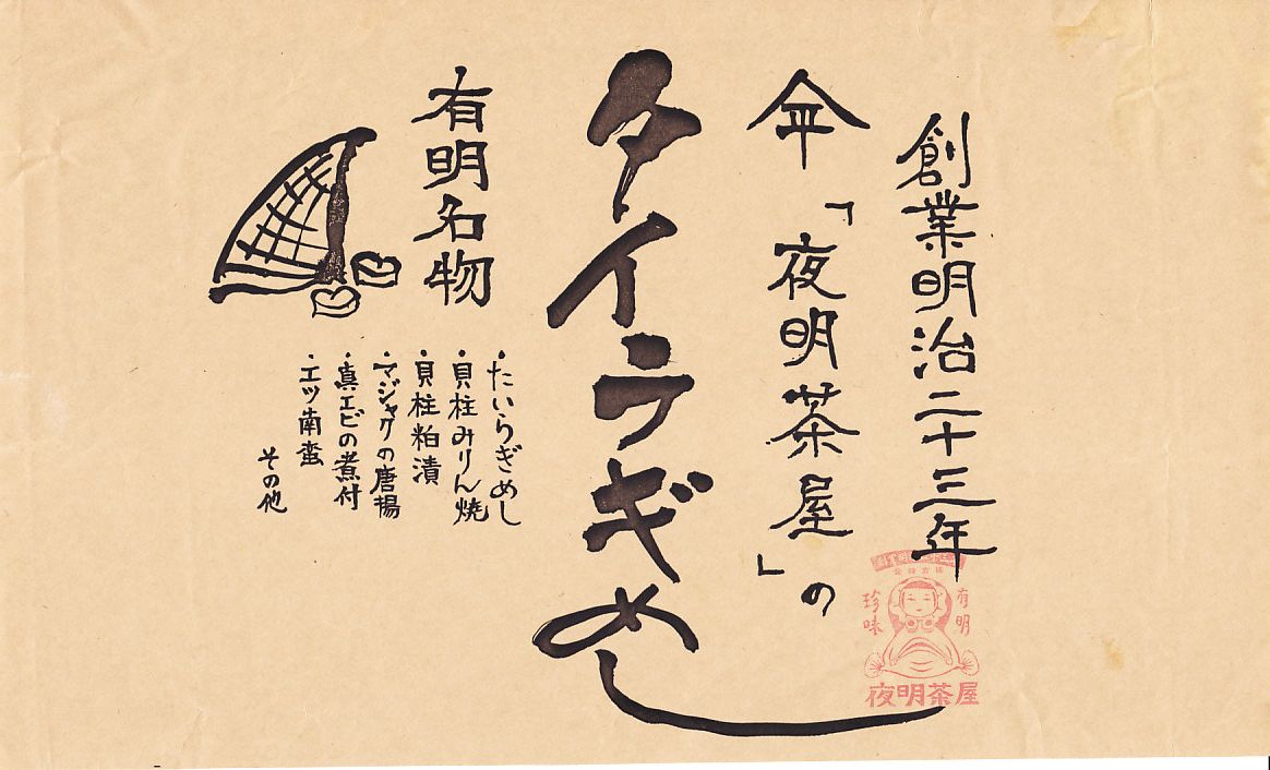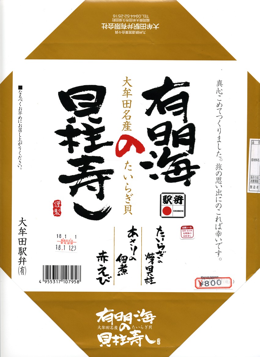 2005(平成17)年に発売。市販の惣菜弁当向け容器に、商品名を書いた掛紙をかけて、ビニールひもでしばる。中身は既存の大牟田駅弁「たいらぎ寿し」とほとんど同じで、貝柱に焼き目が入り、フライや煮物に代わりアサリ佃煮と赤えびが入る。下記「たいらぎ寿し」の解説文のとおり、大牟田駅での入手は事前予約でも無理だが、2005年「九州の駅弁ランキング第2弾」にエントリーされ、各地の駅弁大会に大牟田駅弁として送り込まれた。九州では稀な、本格的疑義駅弁。経木の容器を使うバージョンもある。