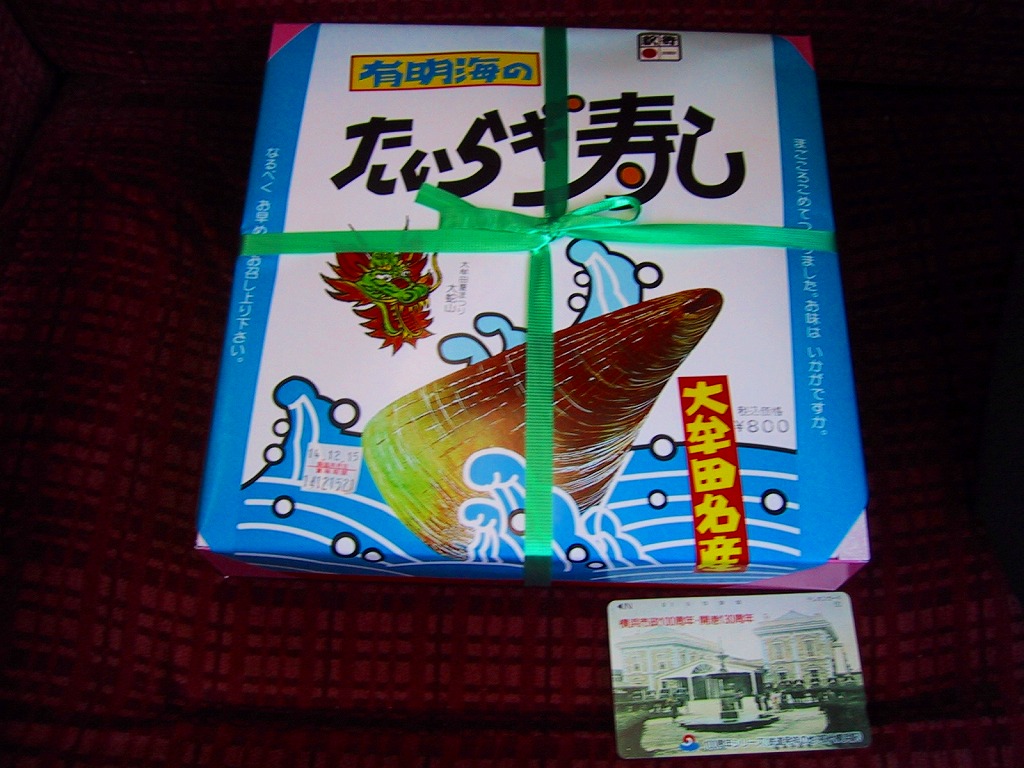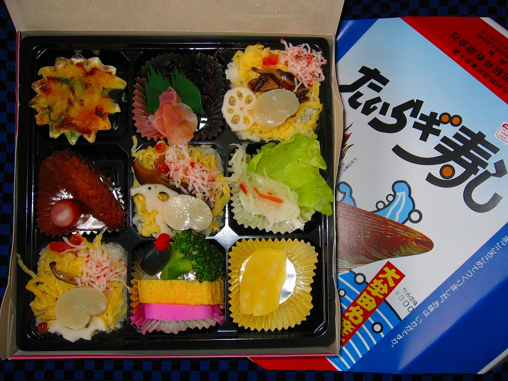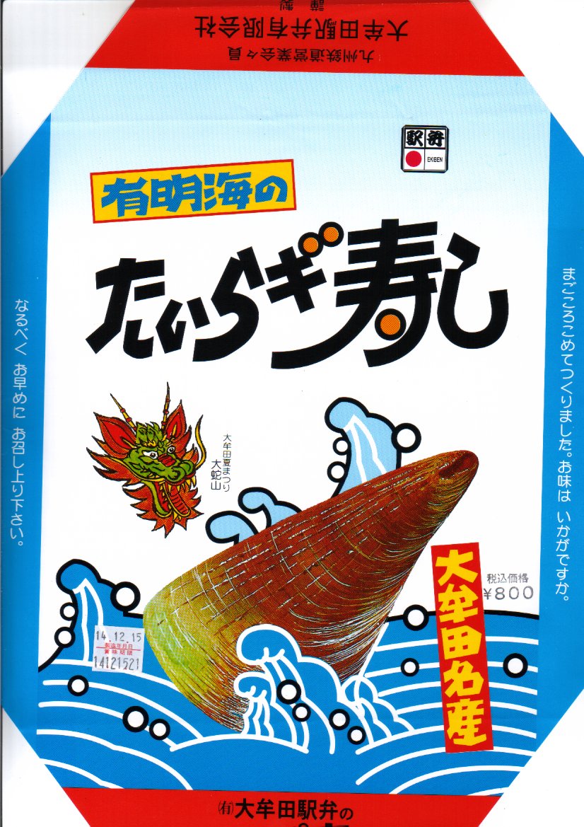 1989(平成元)年2月に発売。大牟田駅で最後の特殊駅弁。他の駅の駅弁でも見たことがある、市販の仕出し弁当向けのボール紙製容器に掛紙をかける。大牟田沖の有明海でよく獲れた二枚貝「タイラギ」の貝柱を、酒で煮て甘酢に漬けてちらし寿司にしたものを、他のおかずなどとともに9つの区画を持つトレーに詰める。ただし1999年頃からタイラギの漁獲がほぼゼロになり、瀬戸内産の材料に切り替えたとか。