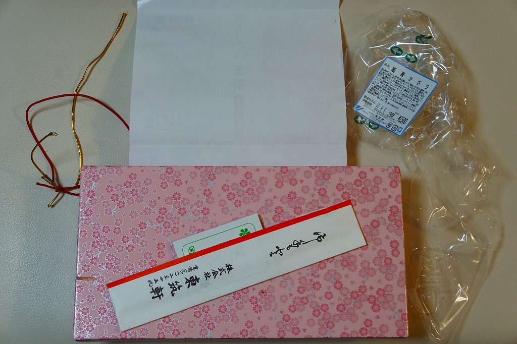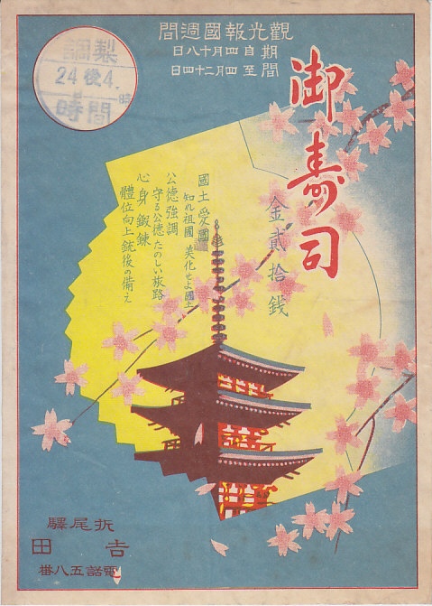おそらく1938(昭和13)年4月24日16時の調製と思われる、昔の折尾駅弁の掛紙。調製印には24日午後4時としかないが、4月18日から24日までの観光報国週間の駅弁掛紙として、かしわめしと同じ絵柄であるため、1938年4月のものだろう。おそらく各駅各社共通で使われた絵柄であり、折尾にないと思う三重塔か五重塔が桜花とともに描かれる。調製元の吉田は、1942年の4社合併でできた東筑軒の前身のひとつ。