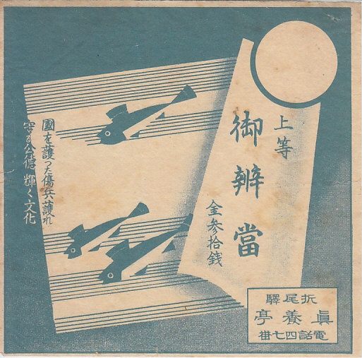 1940年代のものと思われる、昔の折尾駅弁の掛紙。戦時の標語が記される、絵柄は魚か戦闘機なのか。調製元の真養亭(しんようてい)は折尾駅で佐竹眞雄が経営する駅弁屋で、1942年に折尾の3社と直方の業者の合併により東筑軒となった。
