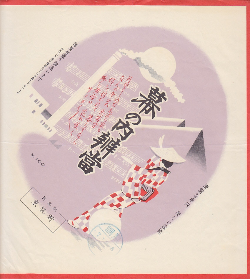 1960年代の、7月19日8時の調製と思われる、昔の折尾駅弁の掛紙。月がさし込むあばら家も、から始めた炭坑節の一節を、五線譜のメロディー付きで掲載した。絵柄はまるでピラミッドに見える炭鉱のボタ山を背景にした踊りか。