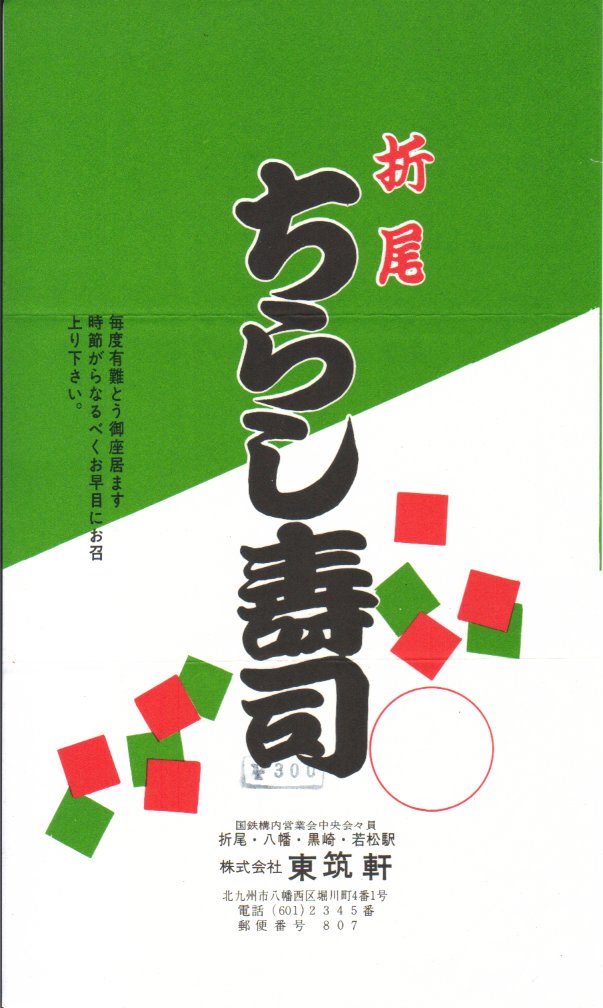 入手状況等から1977(昭和52)年の調製と思われる、昔の折尾駅弁の掛紙。ご覧の通り掛紙に駅弁らしいデザインや記述が何もなく、調製元の情報がなければ駅弁の掛紙と認識できないだろう、あるいは街弁用の掛紙であった可能性もあると思う。