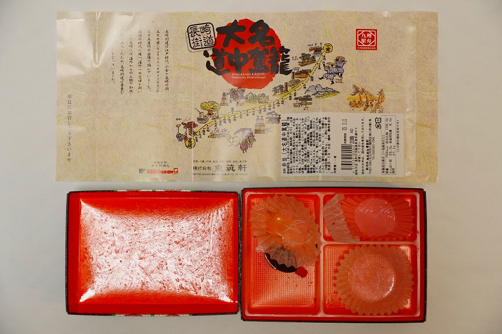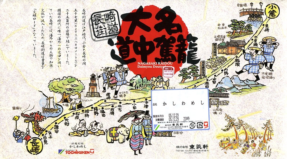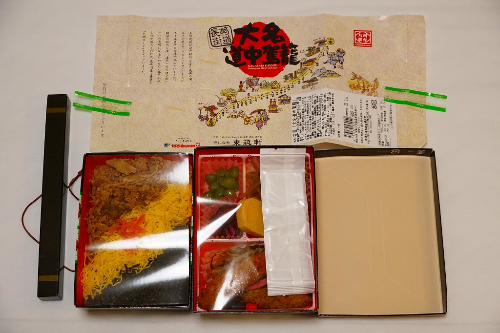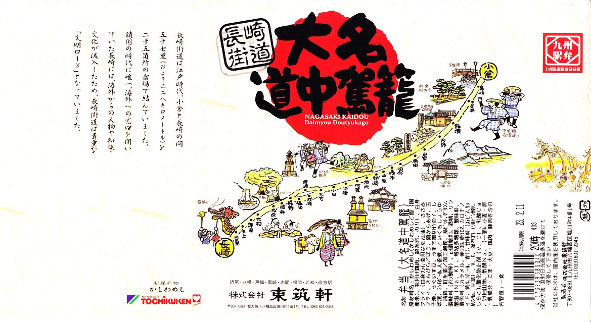 駅弁の名前は「大名道中駕籠かしわ」とも。北九州市八幡西区の長崎街道まちづくりサミットの開催の一環で、1996(平成8)年9月7日に発売。小倉と長崎を結んだ長崎街道をコンセプトにした駅弁。厚紙の黒い小箱を重ね、長崎街道のイラストマップで包み、割りばしを収める担ぎ棒を載せてゴムでしばり、駕籠のような形にした。この容器は市販品のようで、他駅の駅弁でも時々見掛ける。