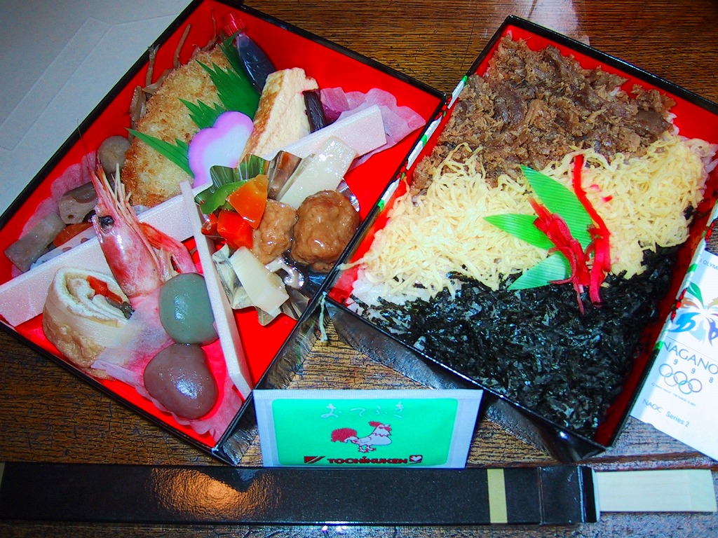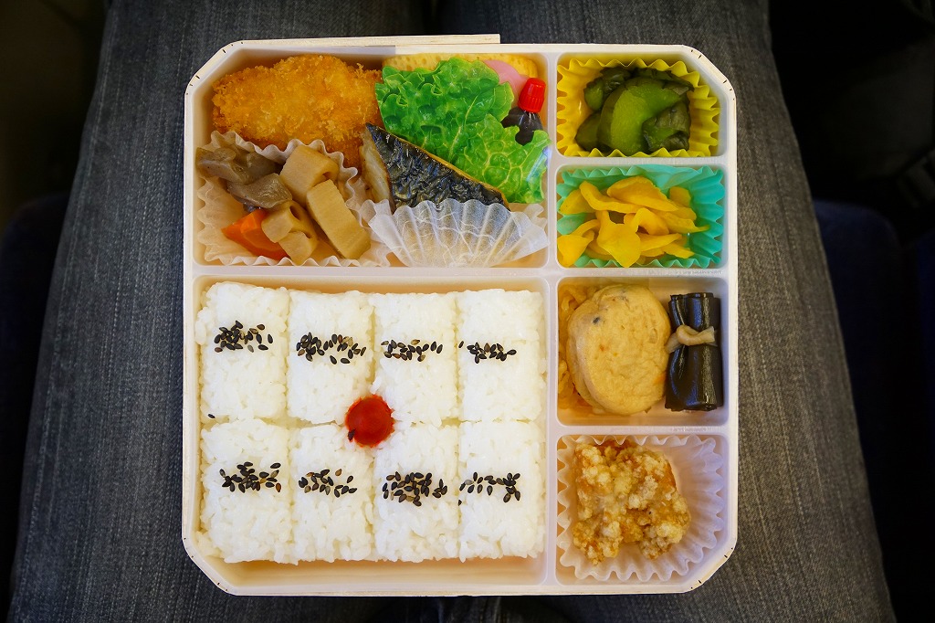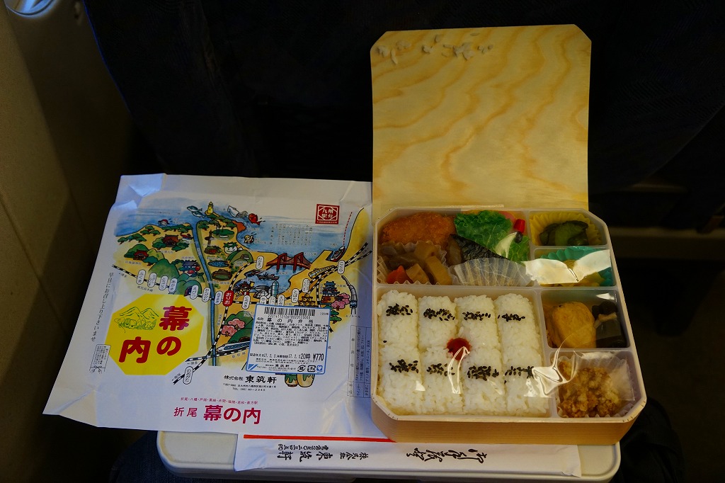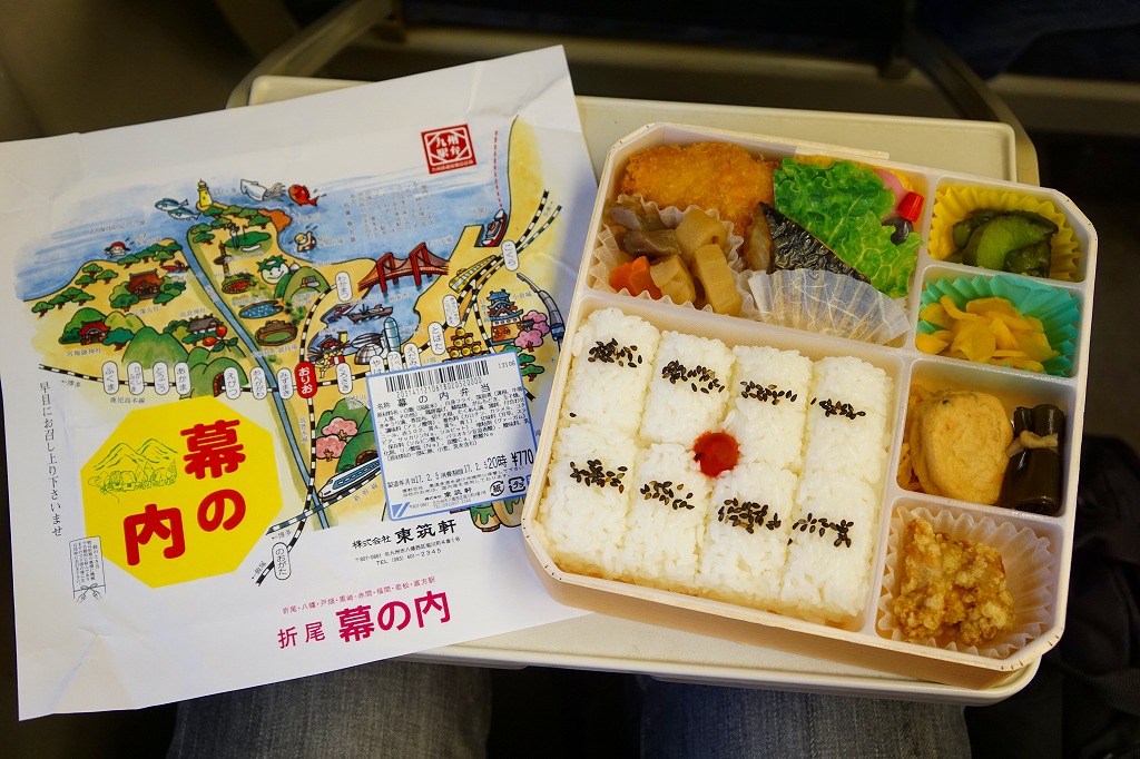 折尾駅の幕の内駅弁。実在する駅弁であるが、売店で見られるのは稀であり、今では調製元のチラシに要予約と書かれる。掛紙の絵柄と容器は、折尾駅の名物駅弁「かしわめし」と共通。内容は日の丸俵飯に白身魚フライ、筑前煮、鶏唐揚、サバ塩焼、がんもどき、玉子焼、きゅうり漬、巻き昆布、切り干し大根、たくあん漬、かまぼこなど。昭和時代の幕の内駅弁の、定番のスタイル。価格は2017年の購入時で770円、2020年時点で800円、2022年3月から850円、9月から880円、2023年9月から920円、2024年9月から970円。2025年3月1日限りで販売終了。